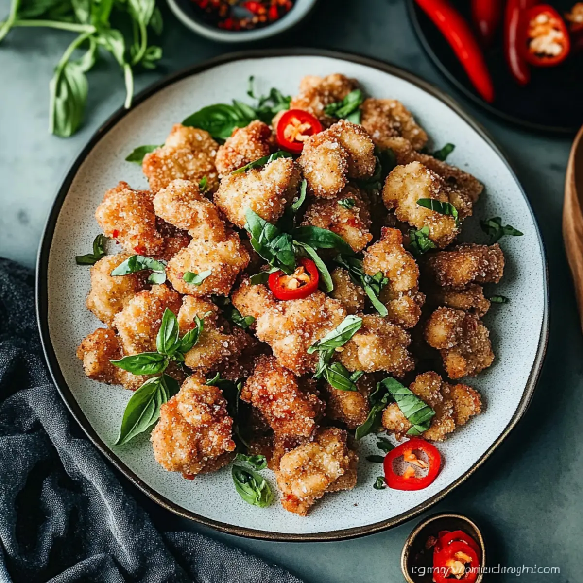 Once cooked, transfer the crispy chicken to a large mixing bowl and toss it with about half of the prepared spice mix. Adjust the seasoning according to your taste preferences. Garnish your Air Fryer Salt and Pepper Chicken with fresh basil and sliced hot peppers for an extra kick if desired. Serve alongside lemon wedges, which will brighten the dish with their acidity and enhance the savory flavors.