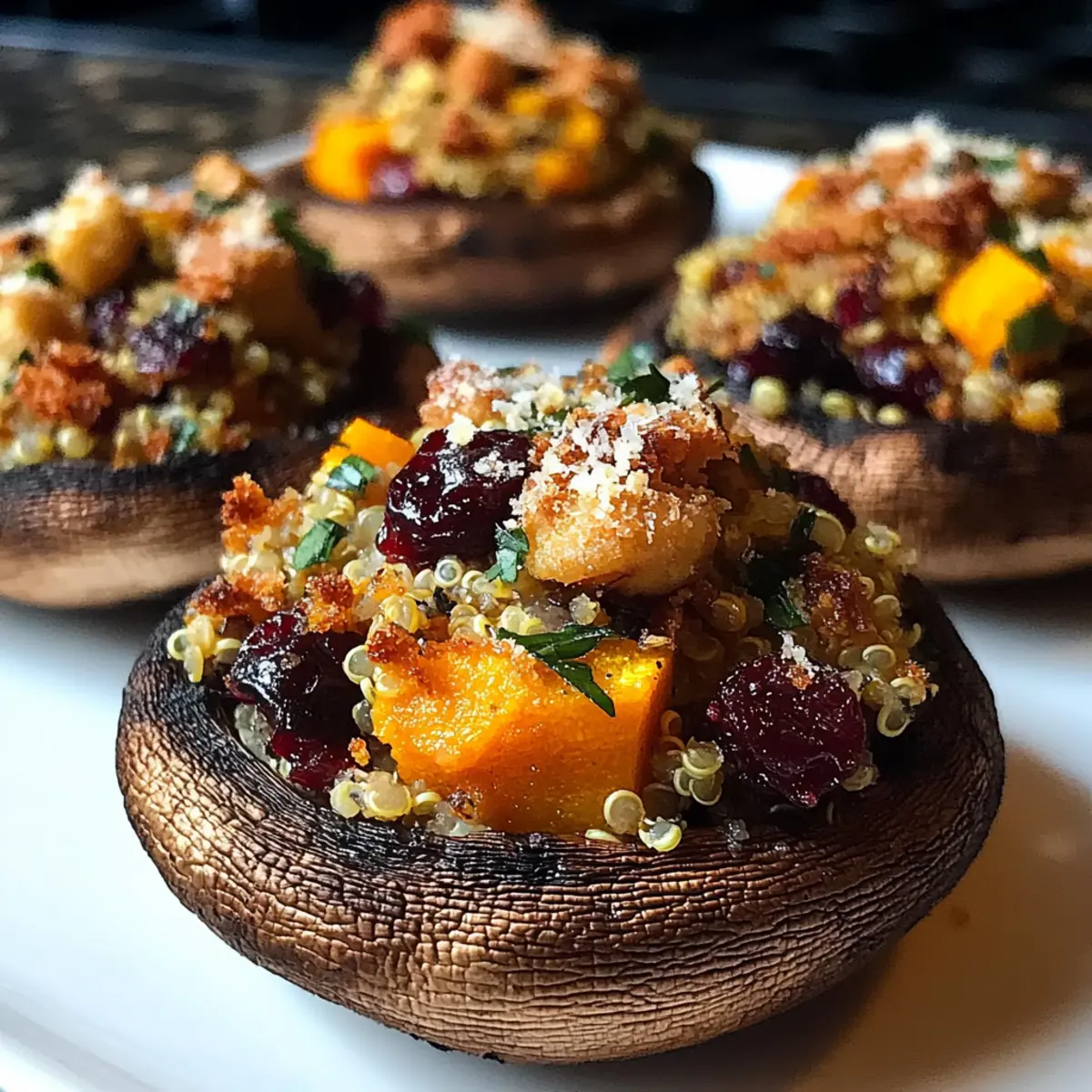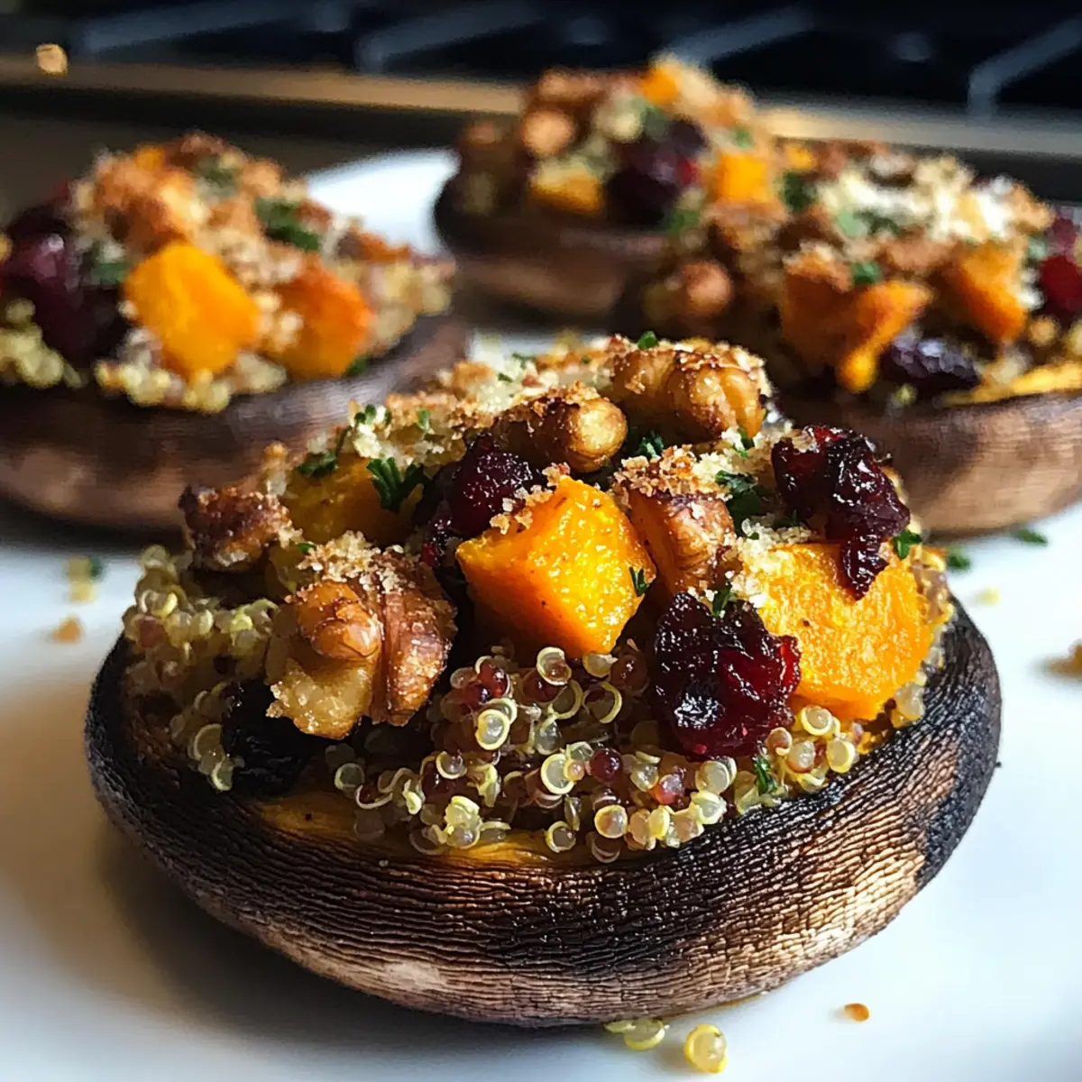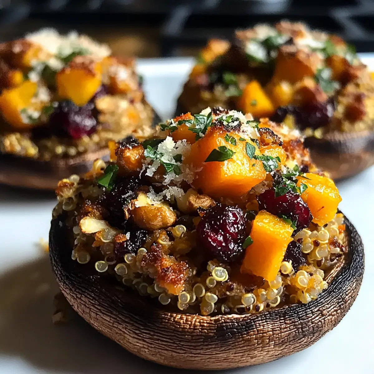 Comforting, savory delight: Each mushroom cap cradles a hearty combination of quinoa, butternut squash, and walnuts, ensuring a deliciously satisfying bite.