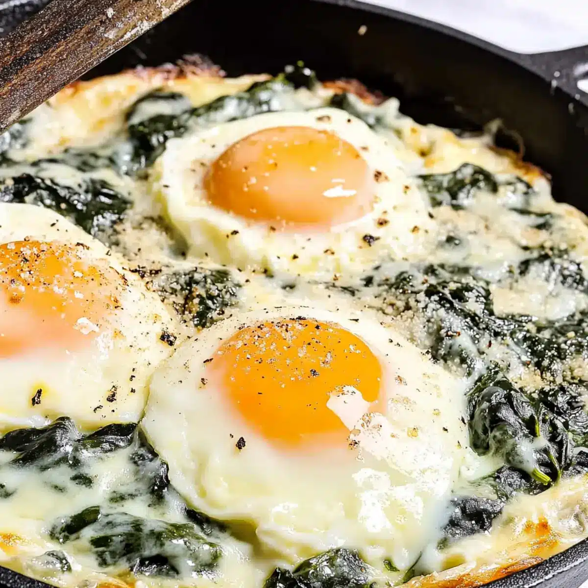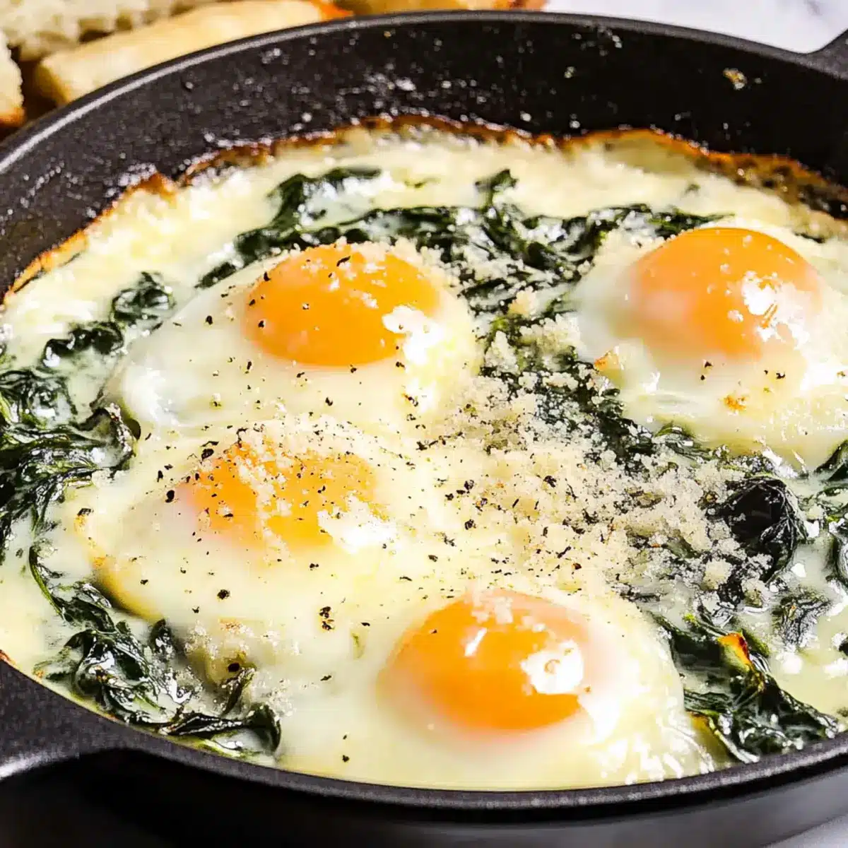 Sprinkle a little extra Parmesan cheese over the spinach, carefully avoiding the egg yolks. Place your skillet in the preheated oven and bake for about 12-15 minutes. Keep a close eye on the eggs; you want the whites to set while the yolks remain slightly runny, which will create a delightful sauce when served.