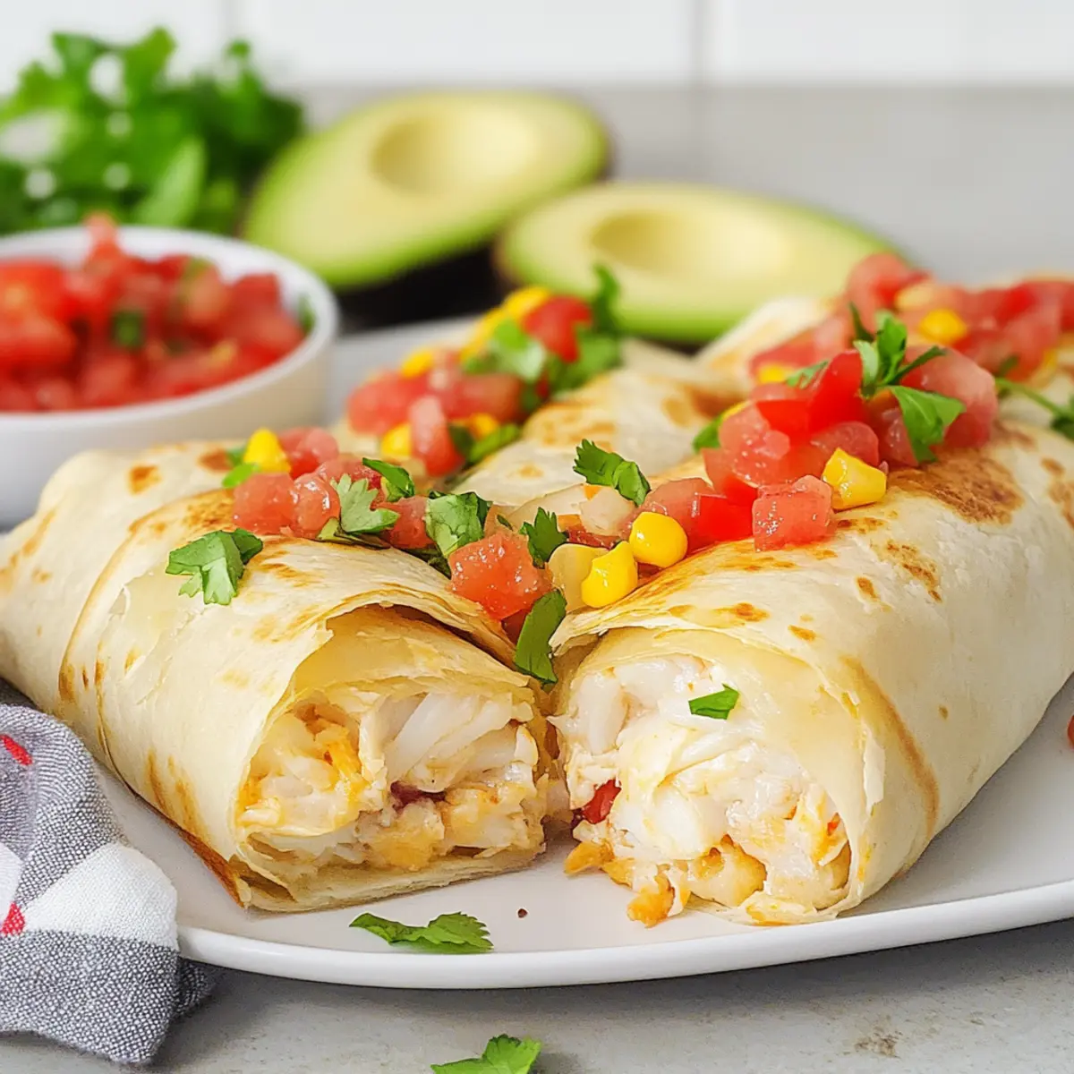 Once out of the oven, let your Baked Imitation Crab Chimichangas cool briefly on the baking sheet. Serve them hot with fresh salsa and slices of avocado on the side. Enjoy this delightful dish as it combines the crunch of baked tortillas with a savory seafood filling!