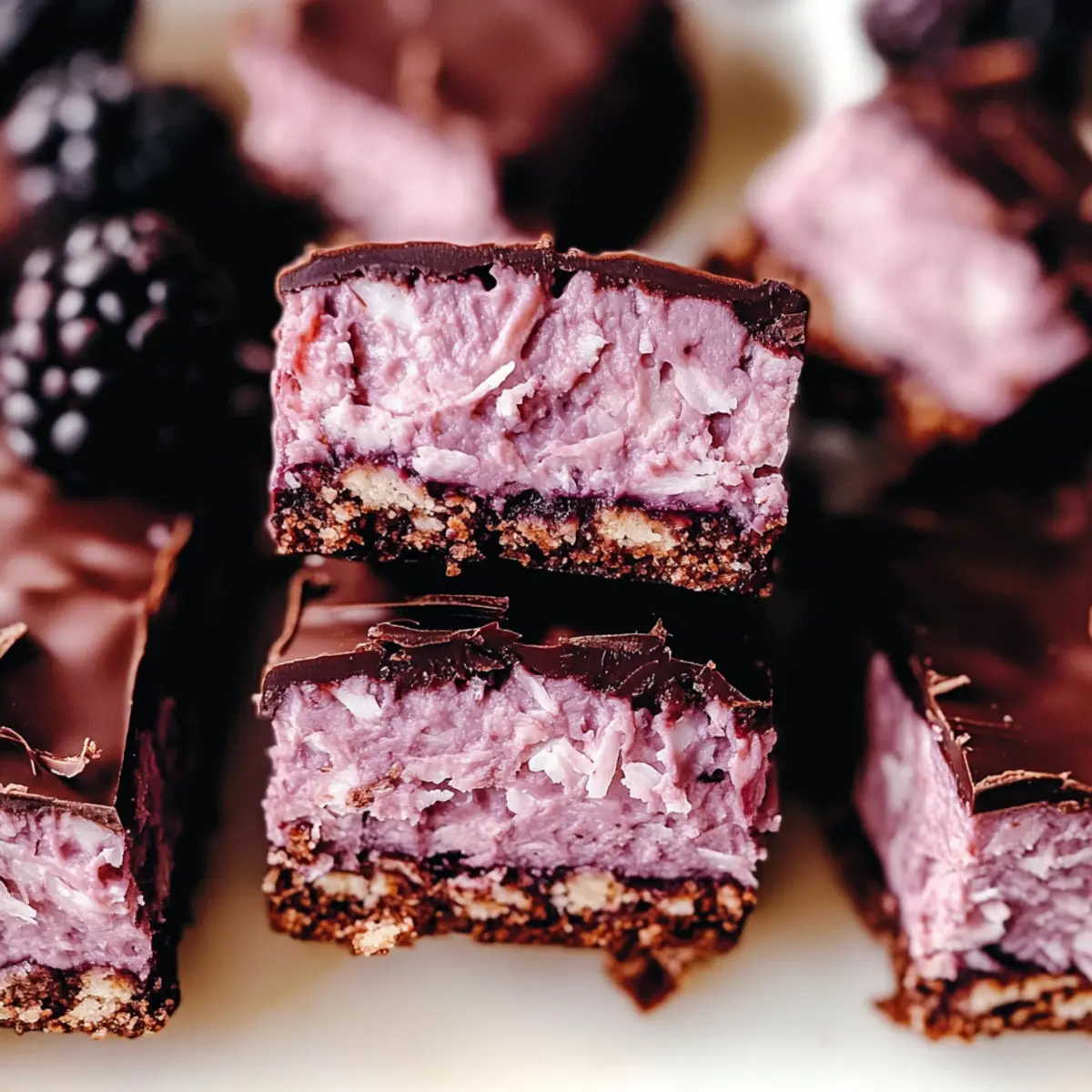 The sun dipped low, casting a golden hue over my kitchen as I rummaged through the fridge for a quick fix. That’s when I stumbled upon a pouch of bright blackberries and a bag of coconut flakes. And just like that, inspiration struck! These Vegan Blackberry Coconut Bars are not only a delightful treat but also a guilt-free way to indulge in something sweet without any of the fuss. With just five simple ingredients and a one-hour commitment—from prep to chill—you’ll find yourself enjoying a chewy, chocolate-dipped dessert that’s perfect for any occasion. Whether you’re winding down after a long day or entertaining friends, these bars are a nourishing choice that won’t weigh you down. Are you ready to whip up a batch of these scrumptious no-bake delights?