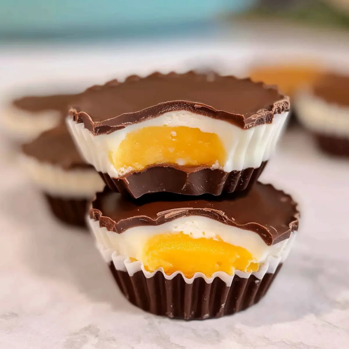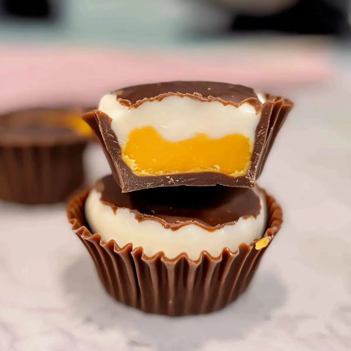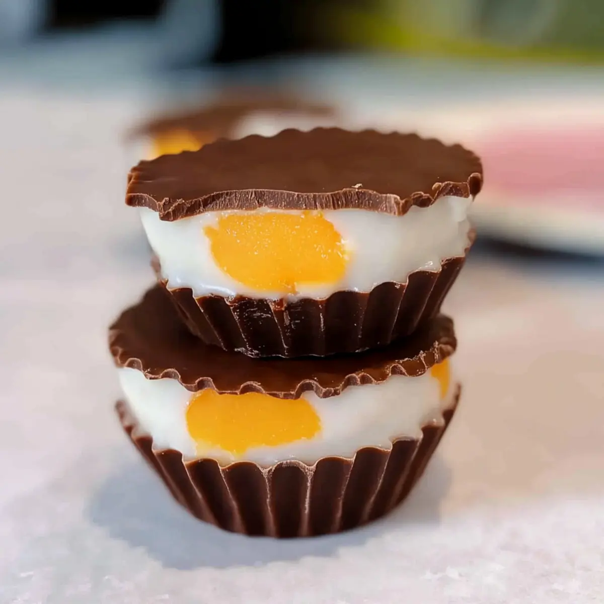 Using a piping bag, carefully add a layer of the white filling (the vanilla mixture) over the hardened chocolate in each muffin liner, filling them about halfway. Then, pipe a small dot of the orange filling in the center of each, replicating the yolk of the Cadbury Creme Egg. This layering will create a beautiful and enticing look.