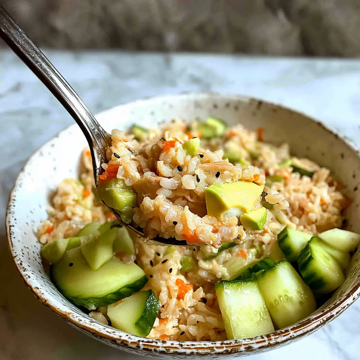In a large serving bowl, layer the cooked sushi rice at the bottom as the base. On top of the rice, artfully pile the spicy tuna mixture, followed by the diced cucumbers and sliced avocado. This colorful arrangement not only looks appetizing but also balances the flavors in each bite.