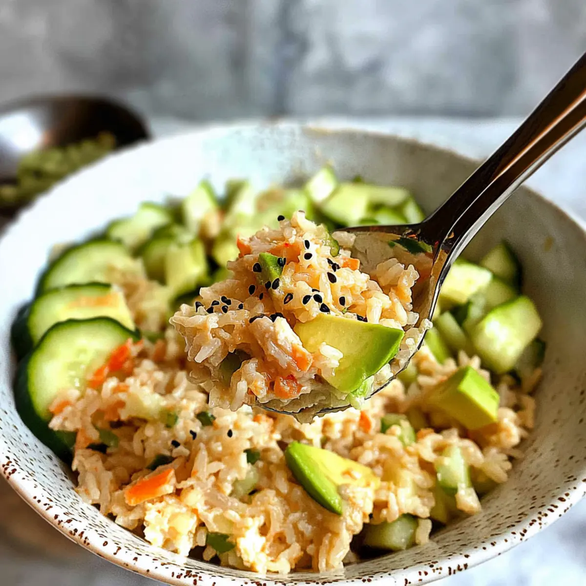 Reheating: Gently reheat the rice mixture in the microwave or stovetop with a splash of water, then add fresh toppings like avocado and cucumbers right before serving.