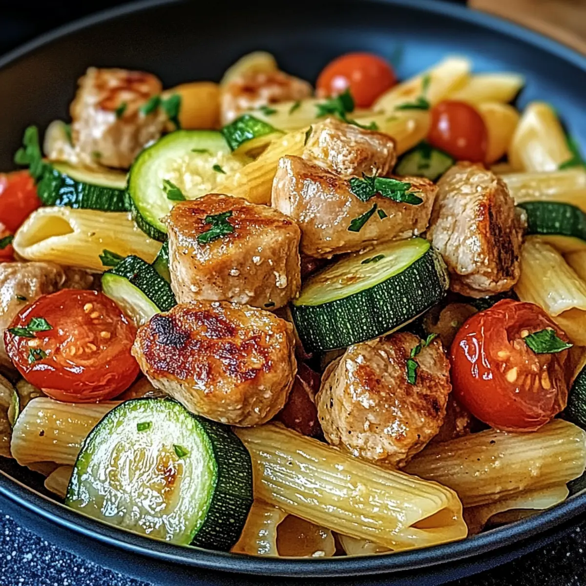 Hearty Chicken Sausages with Zucchini, Tomatoes, and Pasta