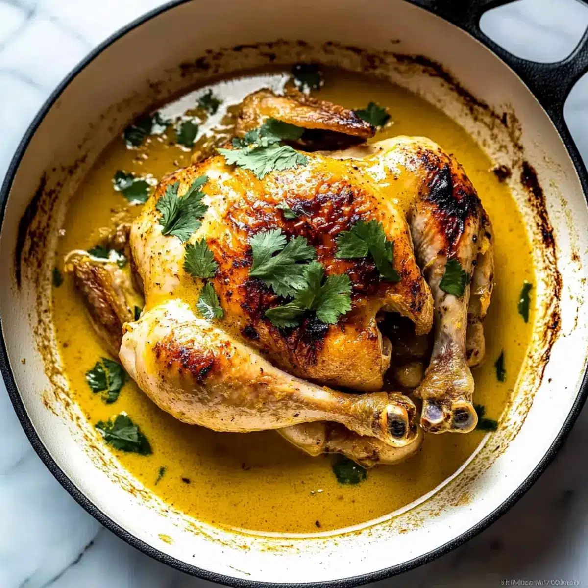 - Pour in the coconut milk, place the chicken breast side up into the pot, cover, and braise gently in the oven for 2 hours.