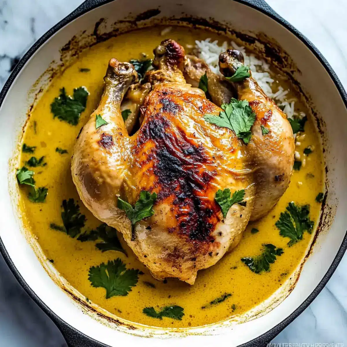 - Remove the pot from the oven, let the chicken rest for 10 minutes, then carve and serve over rice with the coconut sauce drizzled on top.