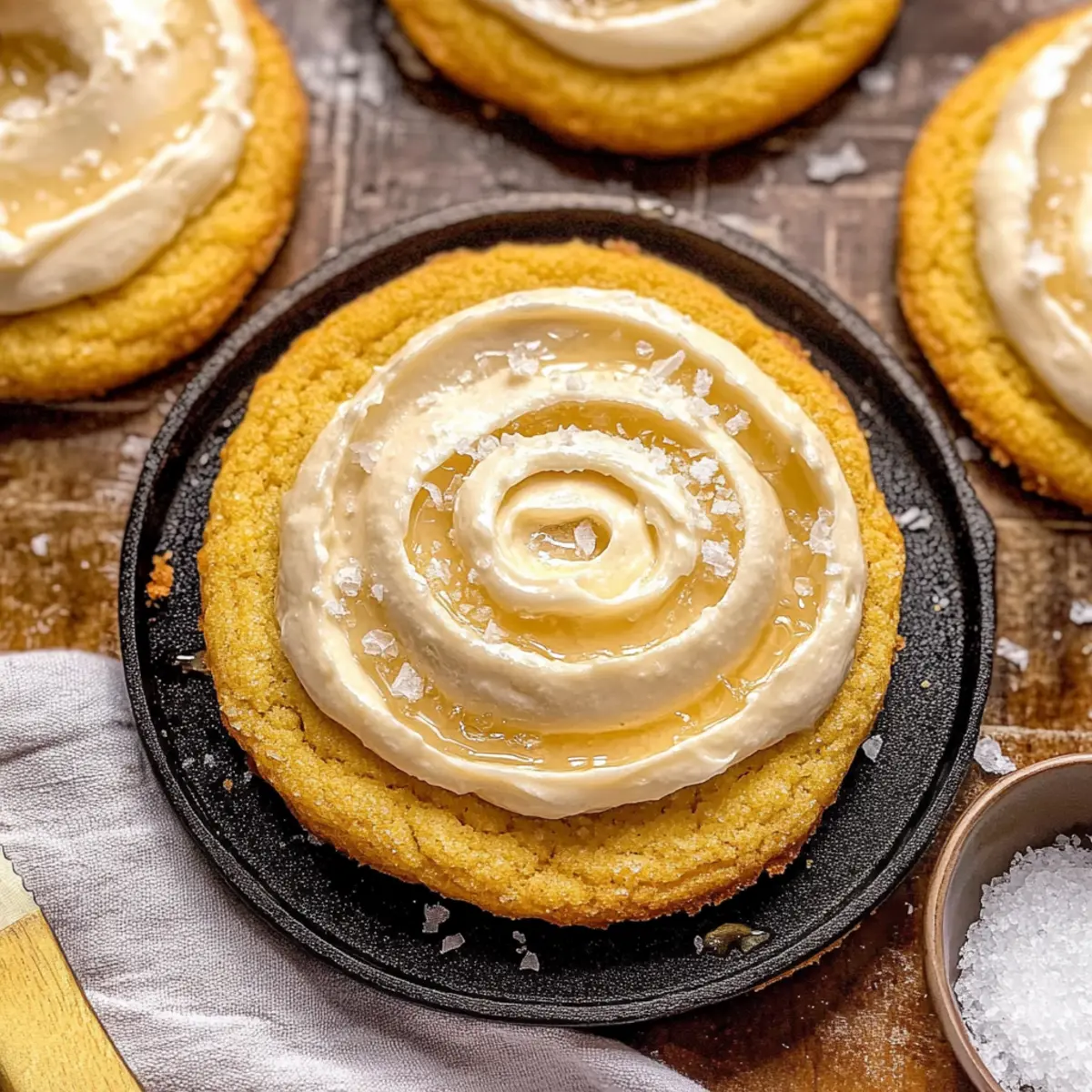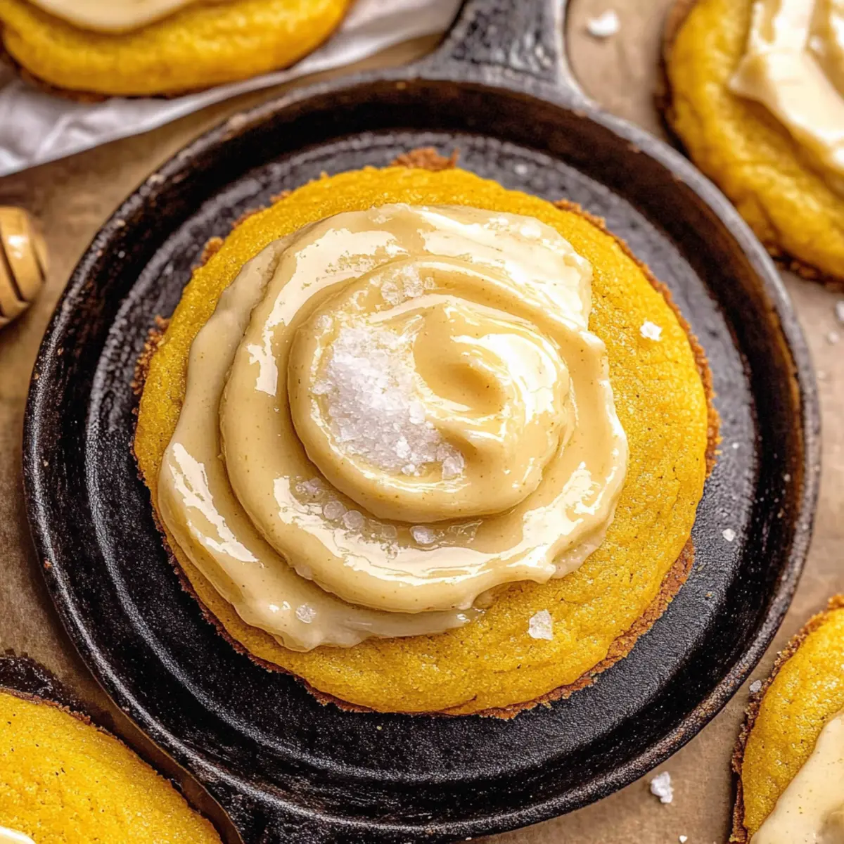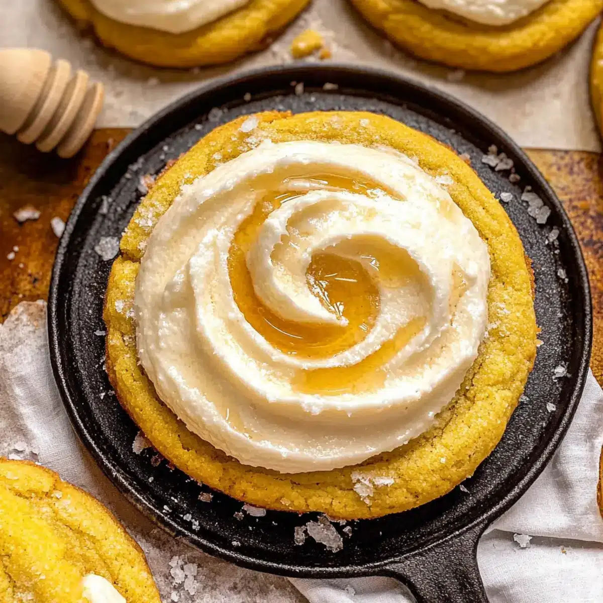 Once the cookies are completely cooled, generously spread the honey butter frosting over the top of each cookie using a knife or offset spatula. For a stunning finish, drizzle a bit of honey across the top of the frosting and sprinkle with flaky sea salt. These luscious touches will elevate your Cornbread Cookies with Honey Butter Frosting and make them truly irresistible!
