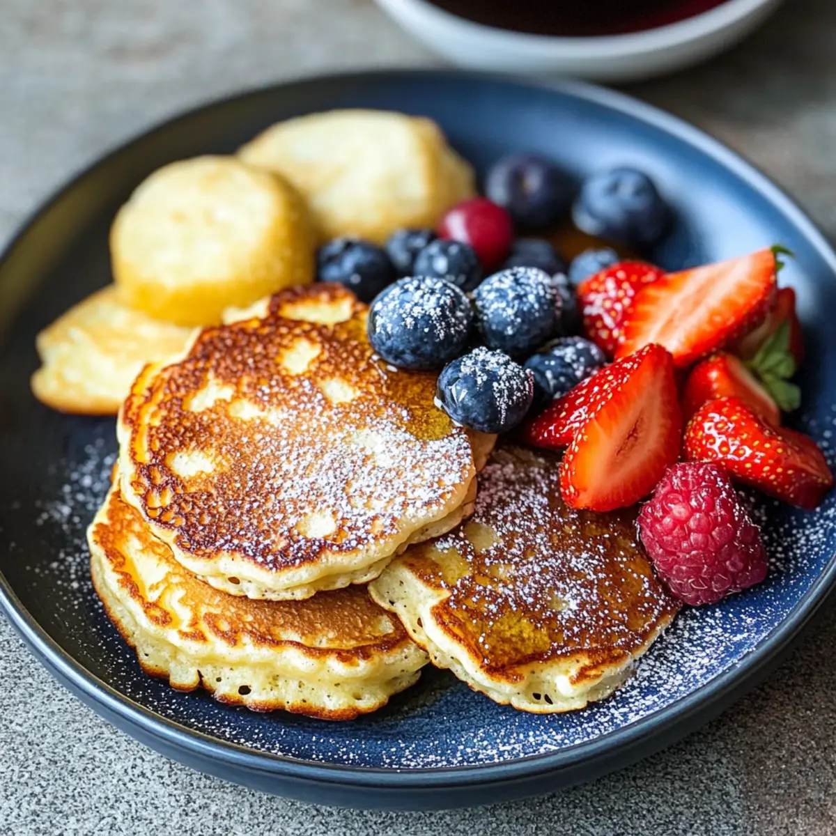 Fresh Fruit Medley: The sweetness of ripe strawberries, blueberries, and bananas adds a refreshing contrast to the fluffy pancakes.