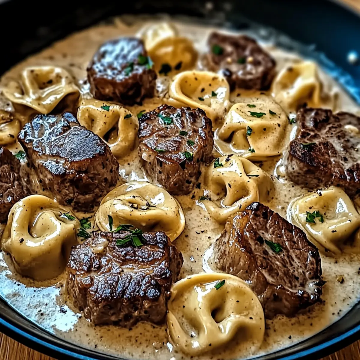 - Return the seared steak and tortellini to the skillet, tossing together to coat evenly with the sauce. Cook for an additional 2 minutes on low heat.