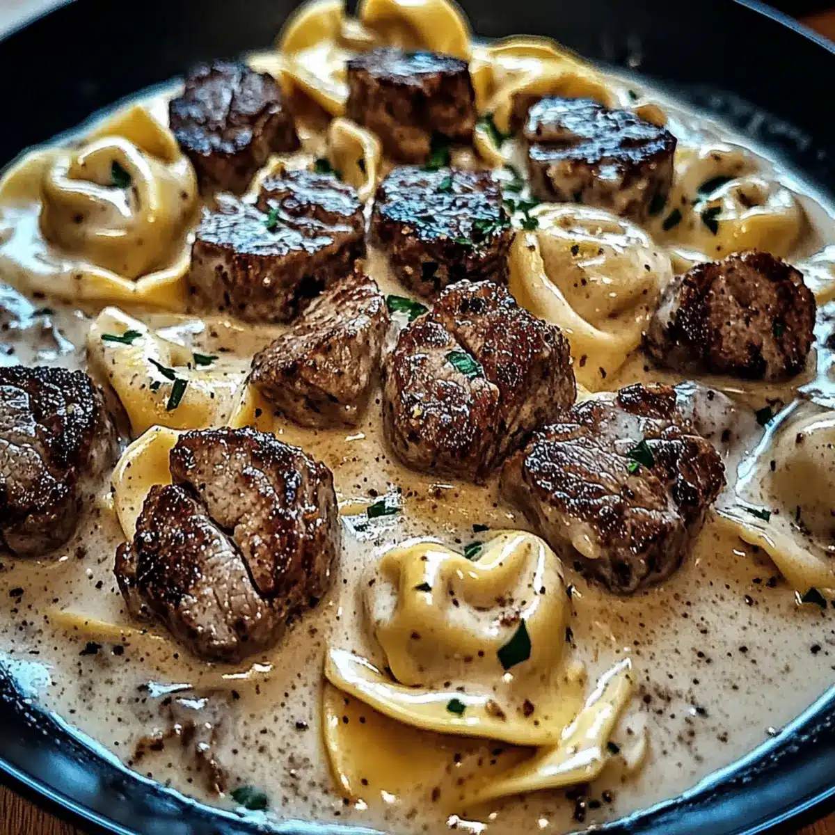 Return the seared steak and the cooked tortellini to the skillet, gently tossing everything together to coat the tortellini and steak evenly with the creamy sauce. Cook for an additional 2 minutes on low heat, allowing the flavors to meld and ensuring everything is heated through. The dish should look rich and inviting, ready to serve!
