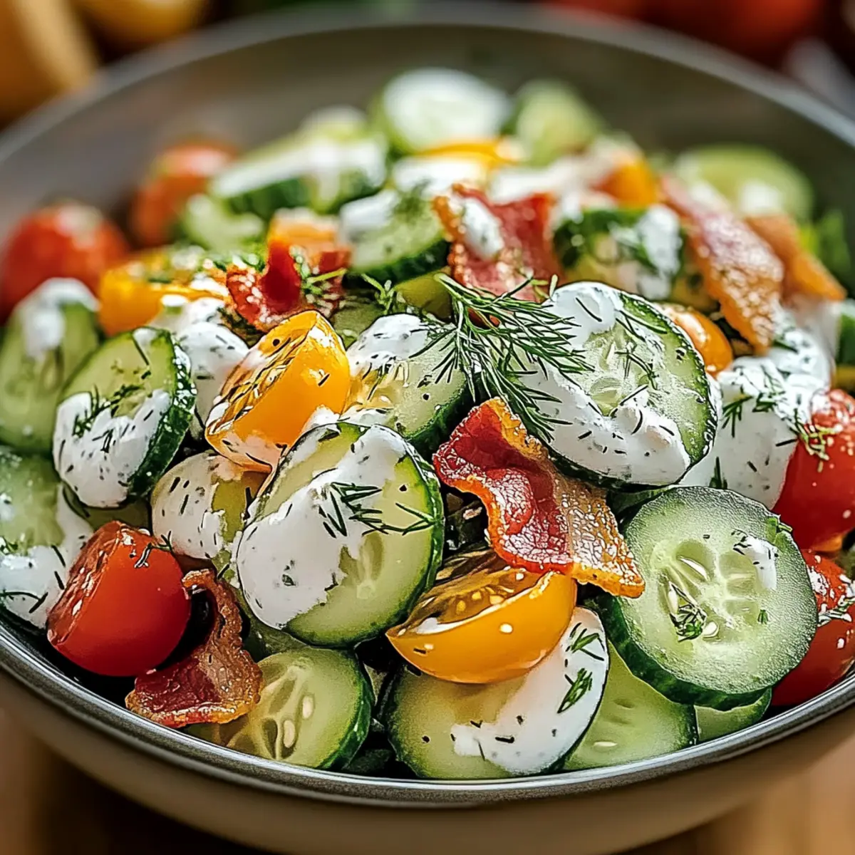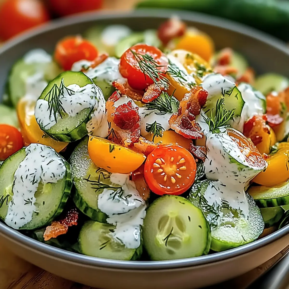 I wouldn’t recommend freezing this salad. The crisp textures of the cucumbers and other fresh ingredients can become mushy when thawed, leading to a less enjoyable experience. Instead, prep your veggies in advance and keep the dressing and bacon separate, so they stay fresh when you’re ready to serve!
