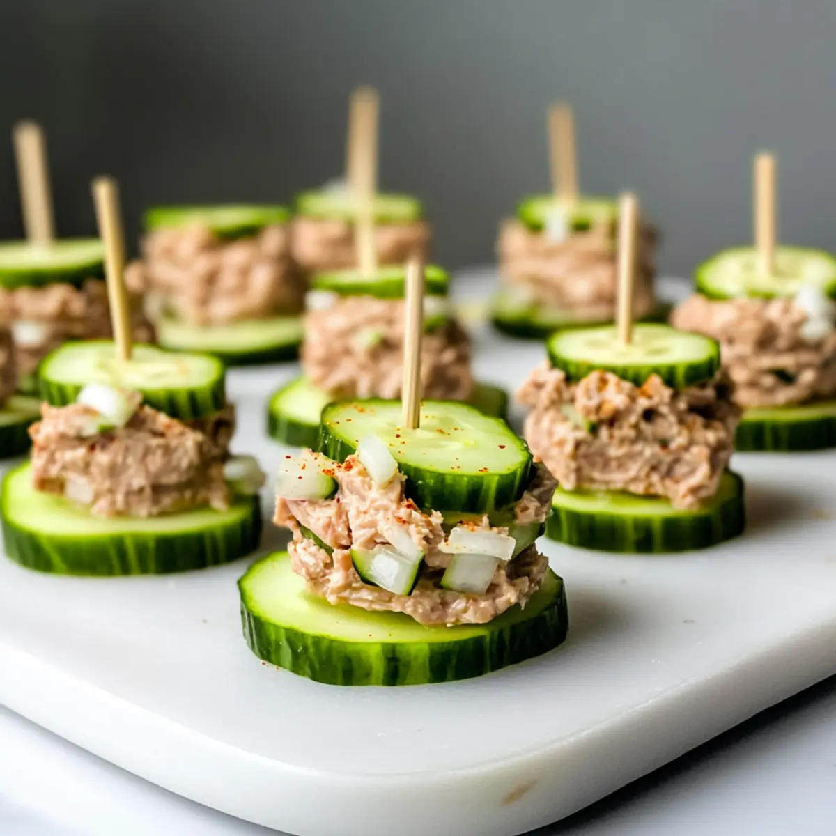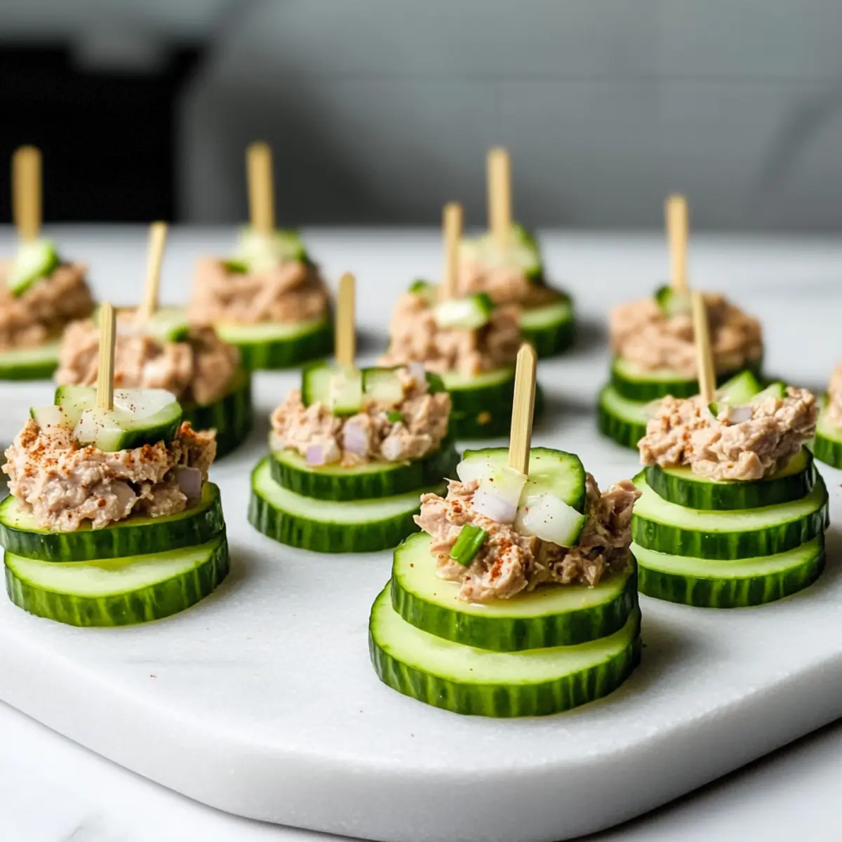 - Gently place the remaining cucumber slices on top to create cucumber tuna sandwiches.