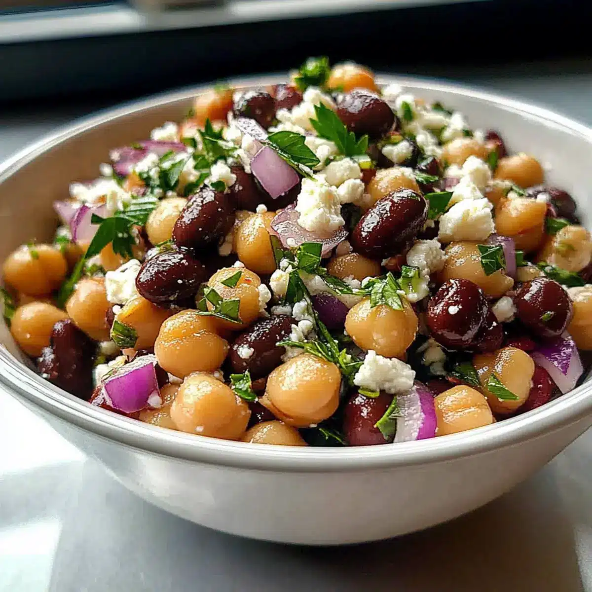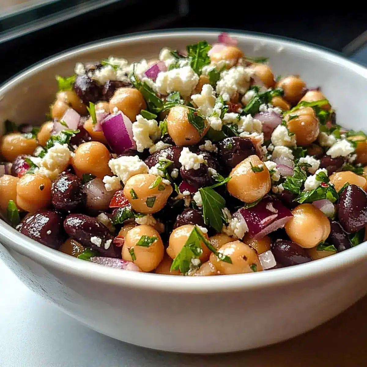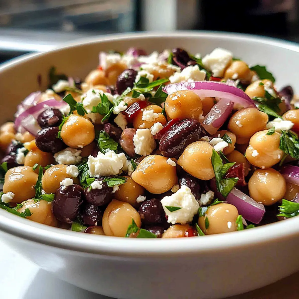 This Divorce Salad is an excellent choice for busy cooks looking to save time during the week! You can prep various components in advance: rinse and combine the chickpeas and black beans up to 3 days ahead of time. The dressing can be whisked together and stored in the refrigerator for up to 5 days; just give it a quick stir before using. For the best flavor, combine the beans with the dressing and store them in an airtight container in the fridge up to 24 hours before serving, allowing the flavors to meld. To maintain the quality, keep the sliced red onion, feta cheese, and fresh parsley separate until you’re ready to toss everything together; this ensures that your Divorce Salad remains fresh and vibrant. When ready to serve, add the garnish, toss gently, and enjoy the delightful combination of flavors!
