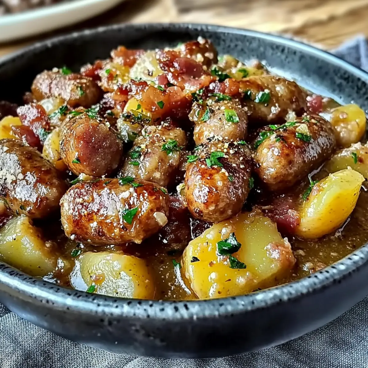 - Add chopped potatoes and fresh thyme, stir to combine, and return browned bacon and sausages.