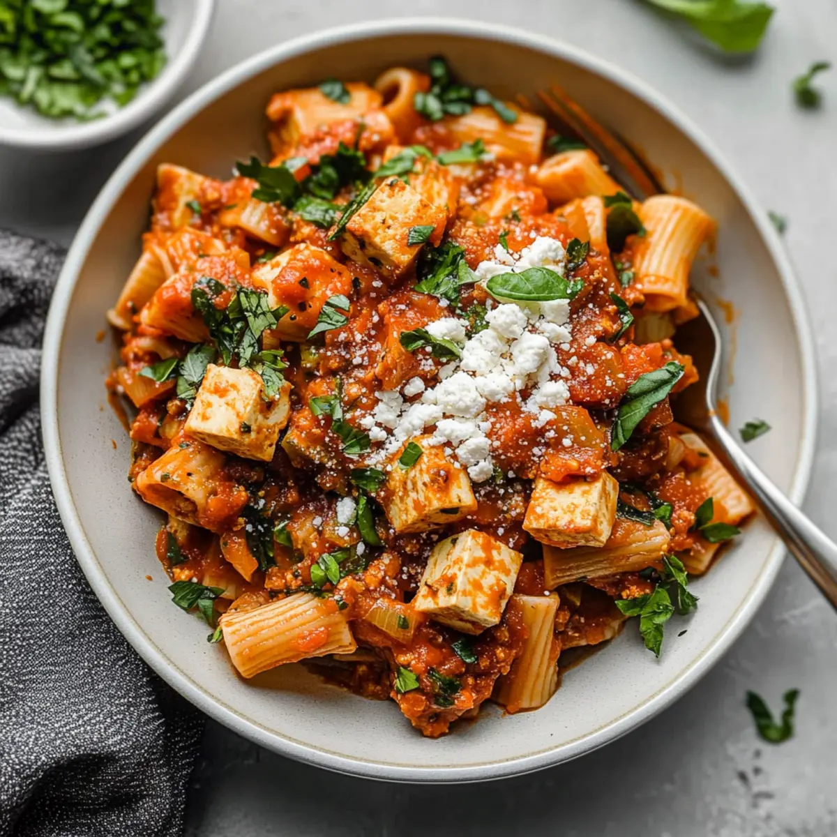 For the best texture in your Easy Tofu Tomato Pasta, it’s recommended to use firm or extra firm tofu. Press the tofu to remove excess moisture for about 15-20 minutes before crumbling it. This step helps the tofu absorb flavors and gives it a satisfying meat-like texture in the dish.