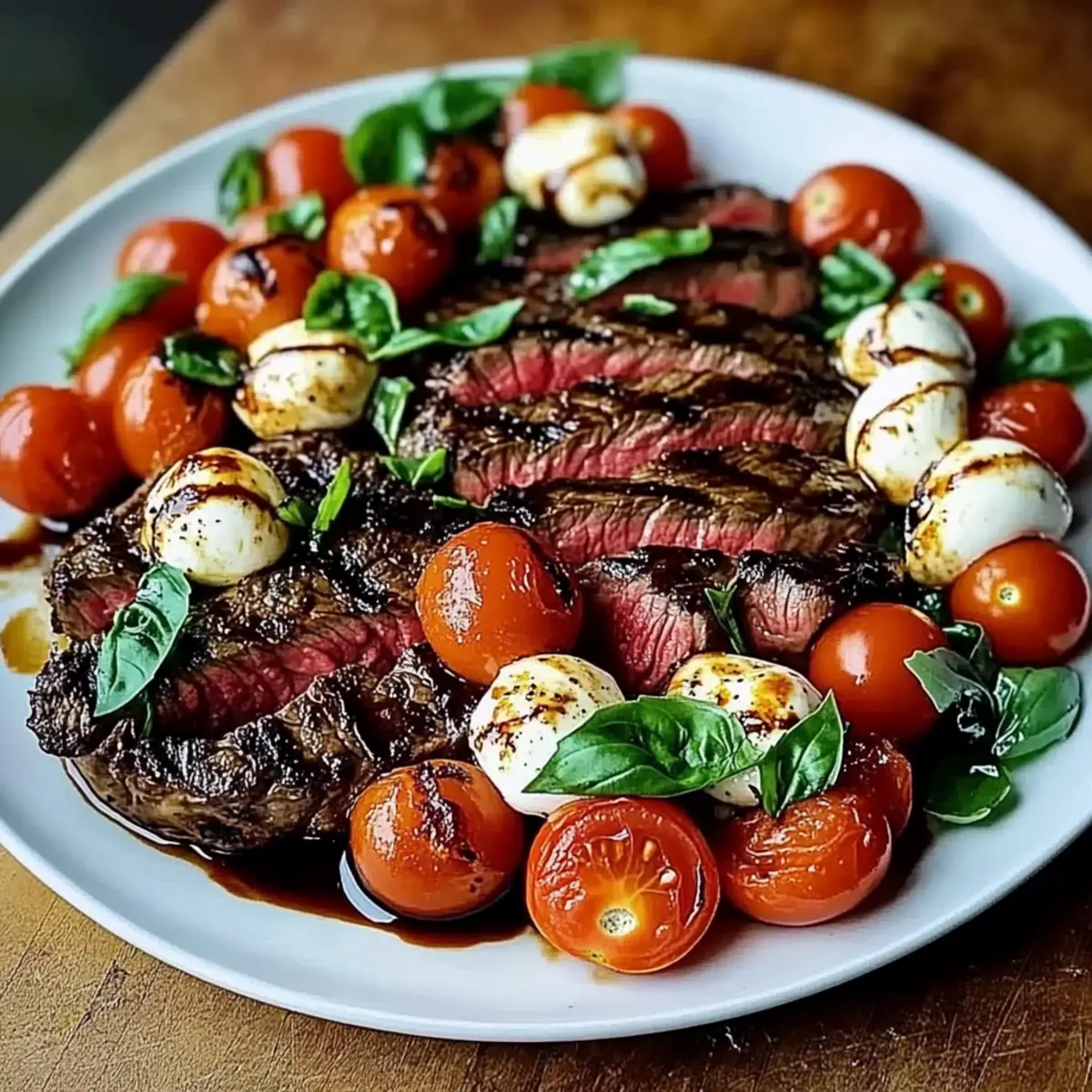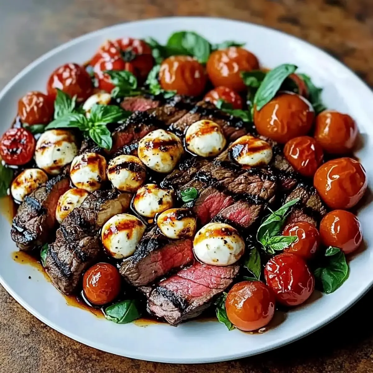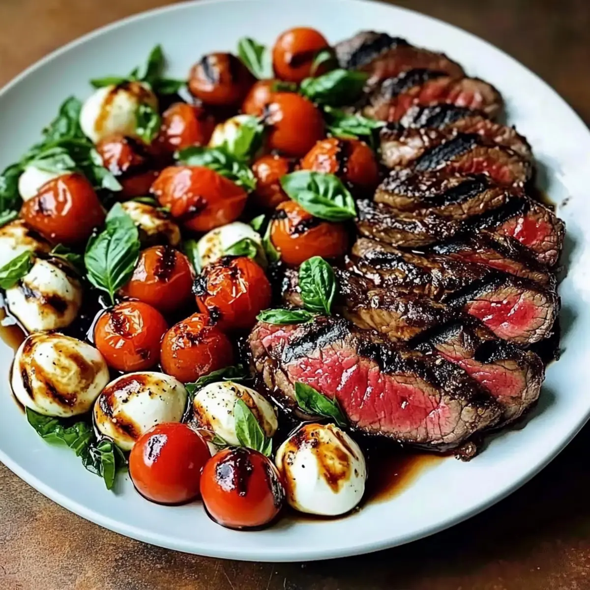 Bold flavors collide: Juicy flank steak paired with fresh cherry tomatoes, creamy mozzarella, and fragrant basil creates an explosion of taste that captures summer in every bite.