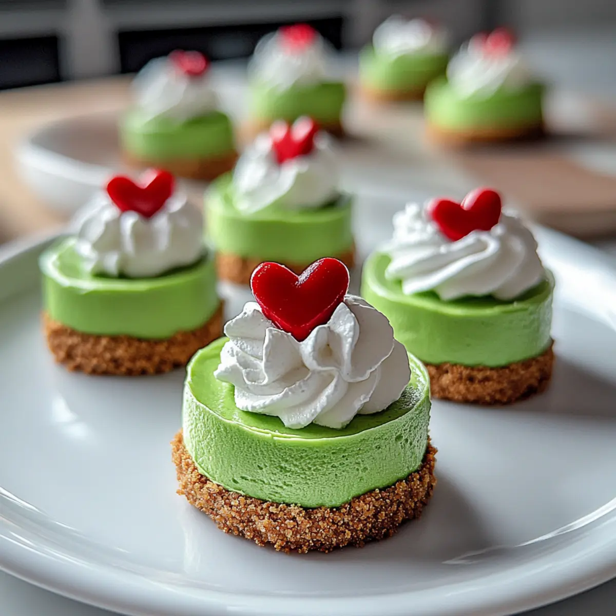 Once chilled, it’s time to add the finishing touches. Pipe or spoon whipped cream on top of each mini cheesecake, creating a festive swirl that enhances their charming appearance. Finally, place a red heart candy or candy sprinkles on each one for that quintessential Grinch touch, transforming these treats into a holiday delight!