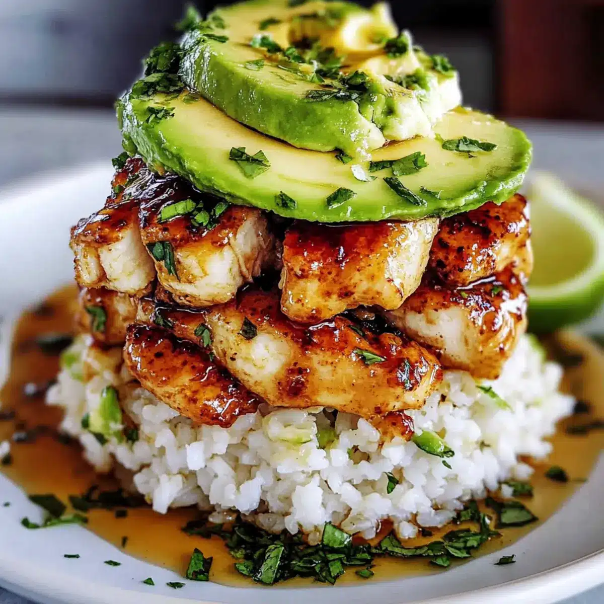 Carefully remove the ring mold, allowing the layers to stand proudly. Drizzle any remaining honey-lime glaze around the plate for a touch of elegance. This not only enhances the flavor but also adds a stunning visual element to your Honey Lime Chicken & Avocado Rice Stack.
