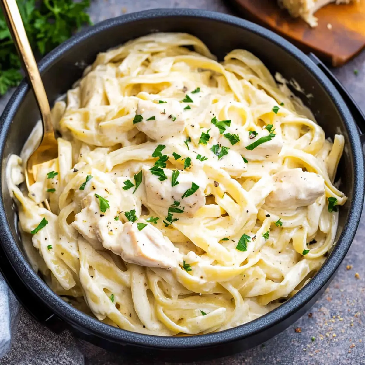 - Shred the rested chicken breasts and mix them back into the creamy pasta. Garnish with chopped parsley before serving.