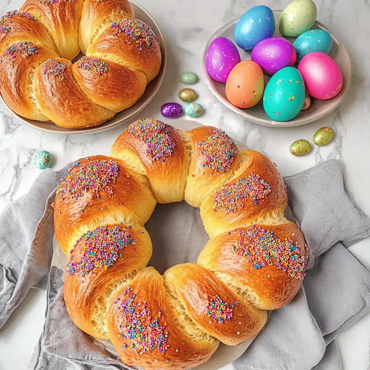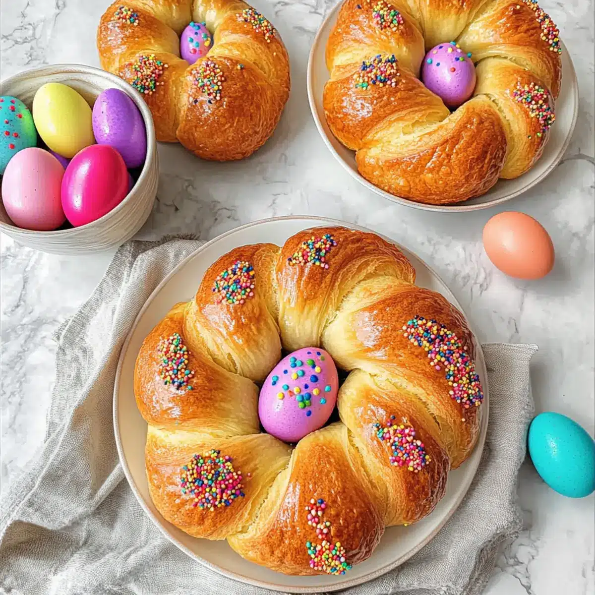 - Preheat oven to 350°F (175°C). Place dyed eggs in the wreath center. Brush bread with egg wash from reserved egg and sprinkle with nonpareils.