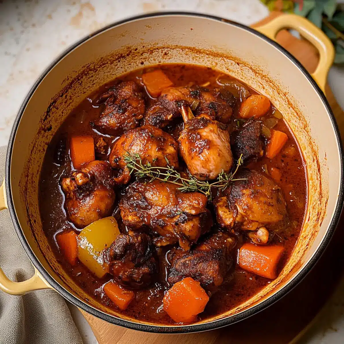 Heat a large pot or Dutch oven over medium-high heat, adding a splash of vegetable oil. Once hot, place the marinated chicken pieces in the pot, skin-side down. Sear for about 5-7 minutes until beautifully browned and crispy. Flip the pieces to brown the other side for an additional 5 minutes, then transfer the chicken to a plate and set aside.