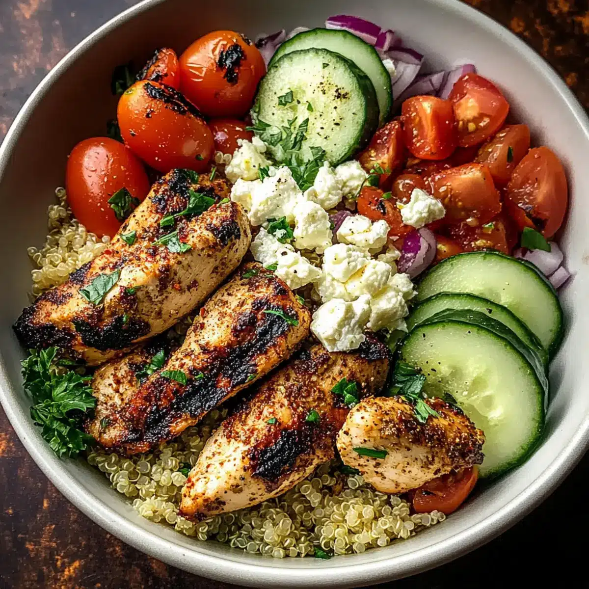 - Slice the cooked chicken into strips and create a base in serving bowls with fluffy quinoa, layered with chicken, veggies, olives, and feta.