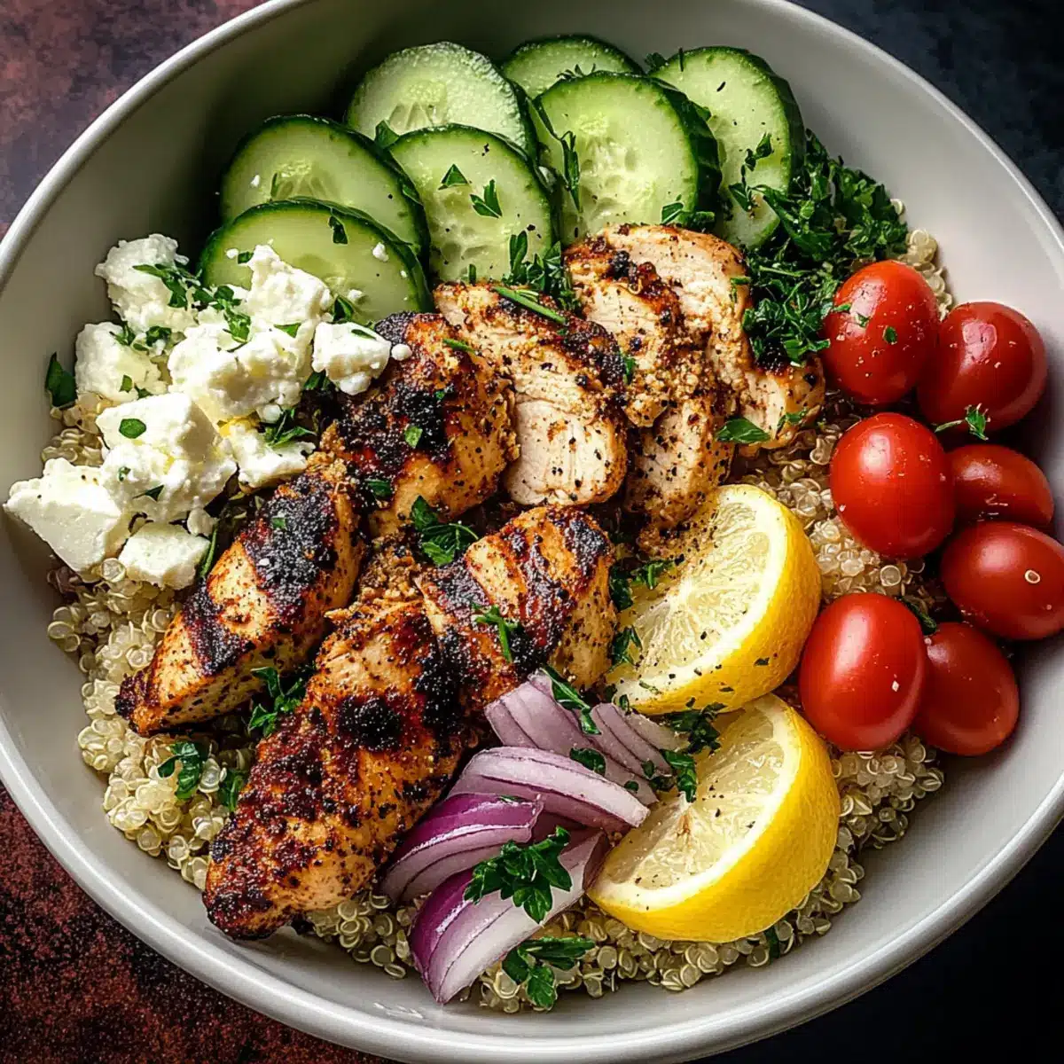 Once the chicken is cooked and rested, slice it into strips. In serving bowls, create a base with the fluffy quinoa, then layer on the sliced chicken, cherry tomatoes, cucumber, red onion, Kalamata olives, and crumbled feta cheese. This vibrant display not only looks beautiful but also represents the heart of your Mediterranean Chicken Bowl.