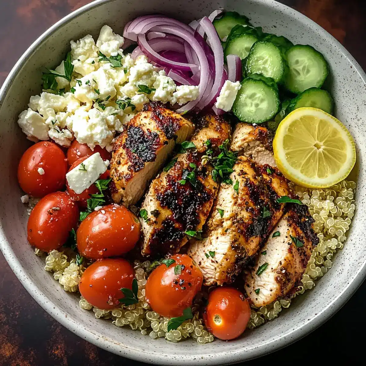 Serve your Mediterranean Chicken Bowl immediately, accompanied by lemon wedges. A quick squeeze of lemon just before eating will enhance the freshness and brighten all the flavors. Enjoy this delicious meal fresh from your kitchen, savoring each bite of this colorful culinary masterpiece!
