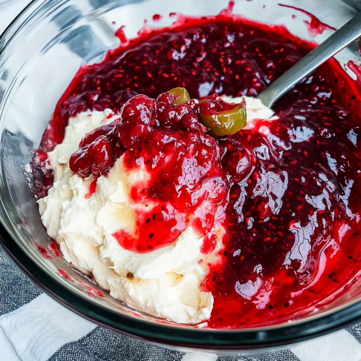 - Spoon the creamy mixture into a serving dish and spread raspberry jam over the top.