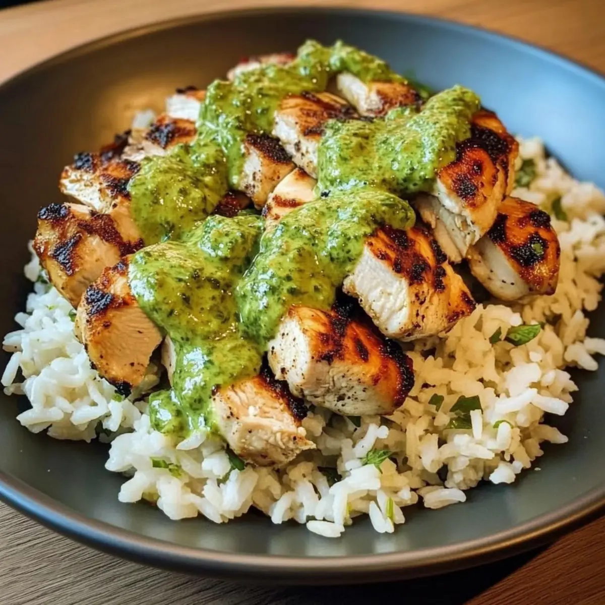- Assemble Bowls: Fluff rice, serve in bowls, top with chicken slices, drizzle with aji verde, and garnish with cilantro and lime wedges.