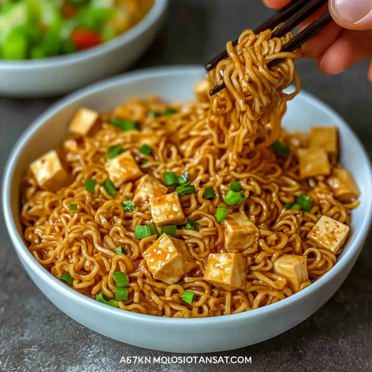 - Serve hot, garnished with chopped scallions and sesame seeds.