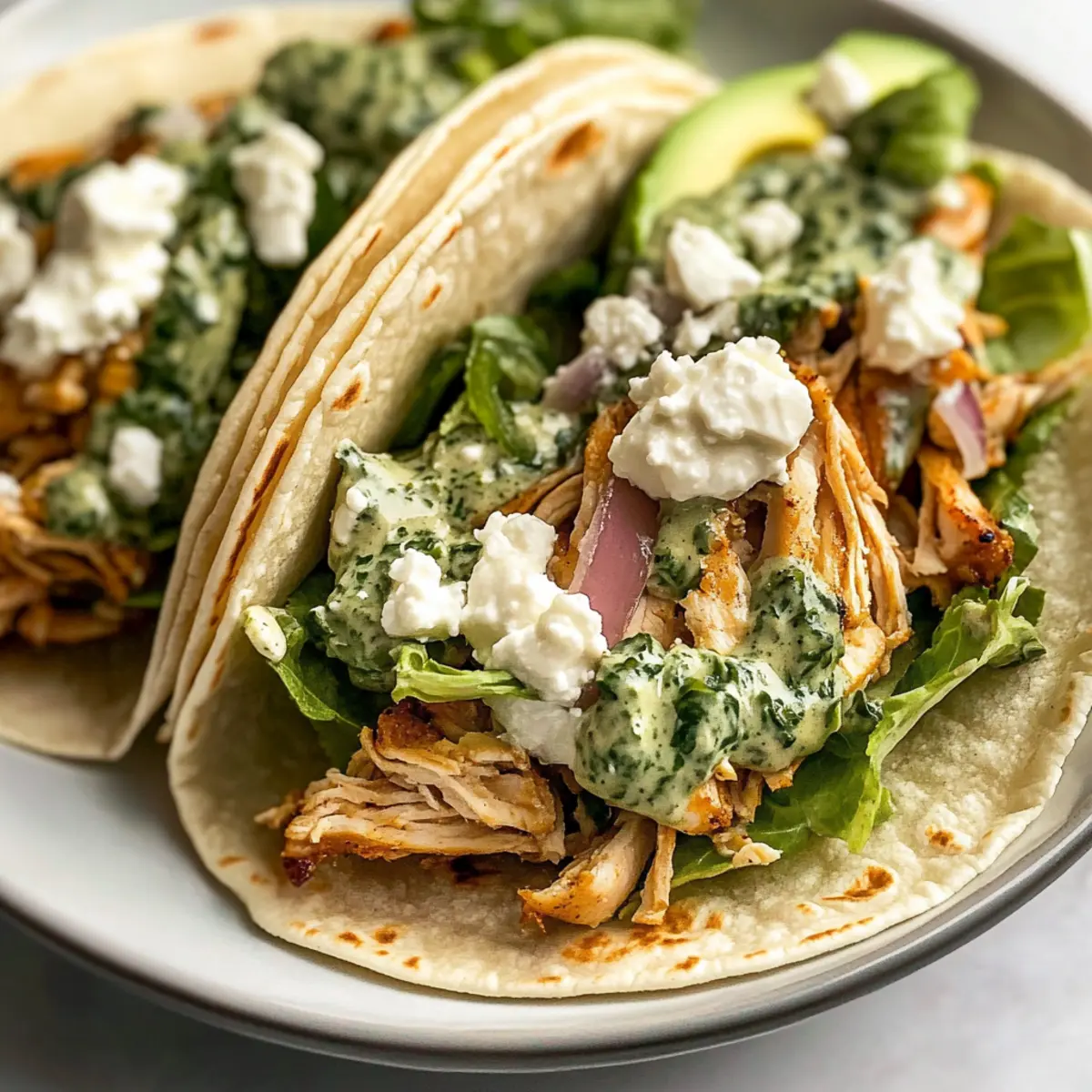 Warm the flour tortillas in a separate skillet or microwave for a few seconds until they are pliable. Layer each tortilla with a generous portion of romaine lettuce, slices of avocado, the chicken mixture, and crumbled feta cheese. Finally, drizzle the creamy chimichurri sauce over the top, completing your delicious shredded chicken tacos. Enjoy while warm!