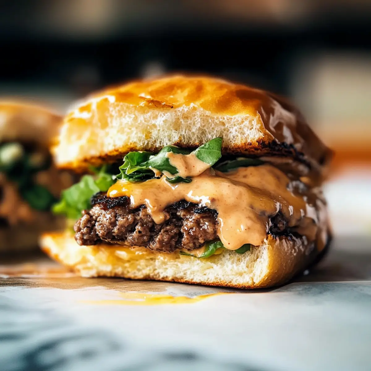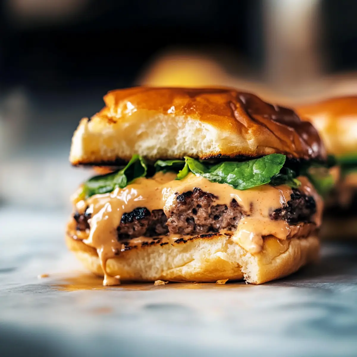 - Spread house sauce on the toasted buns, layer with cheesy patties, and add your favorite toppings.