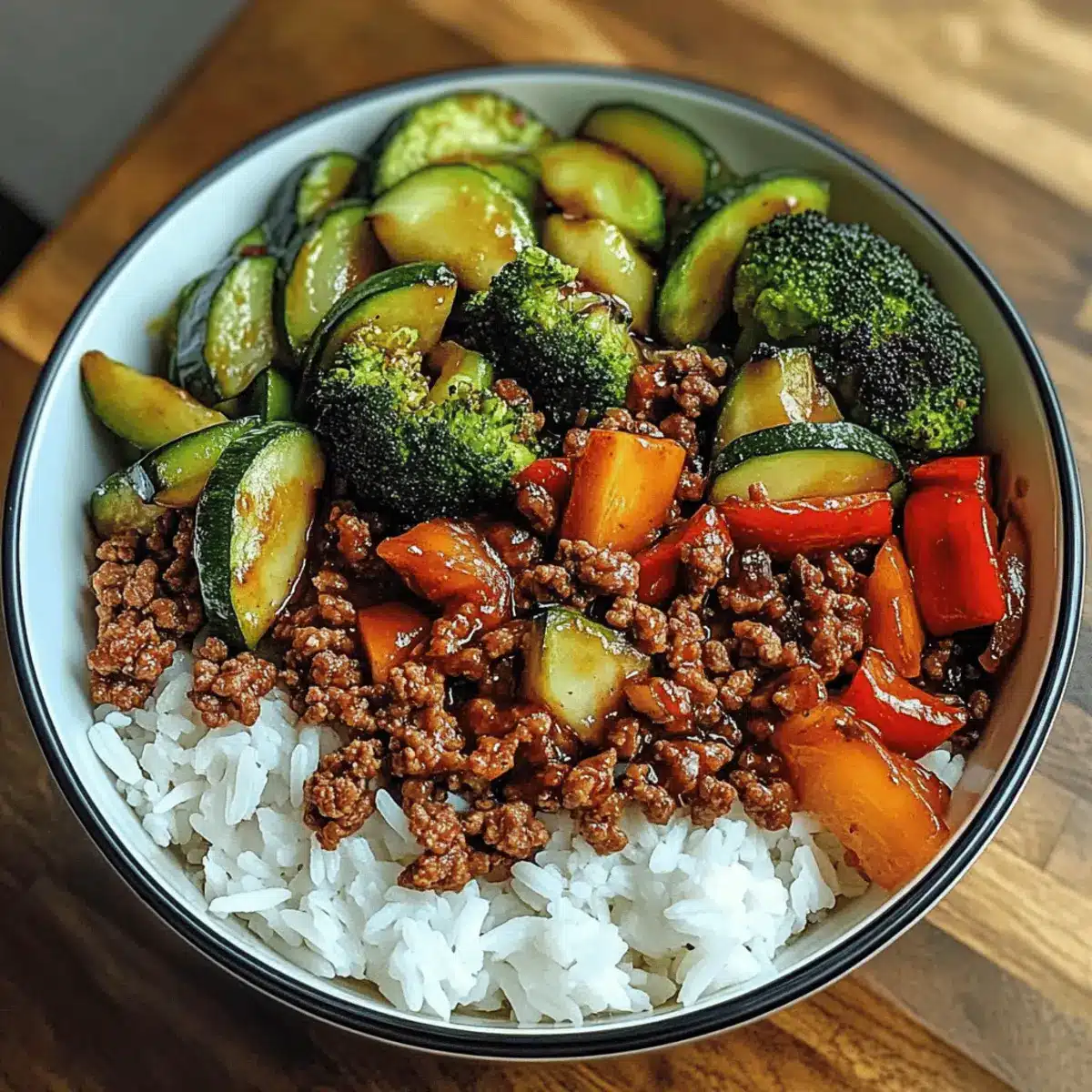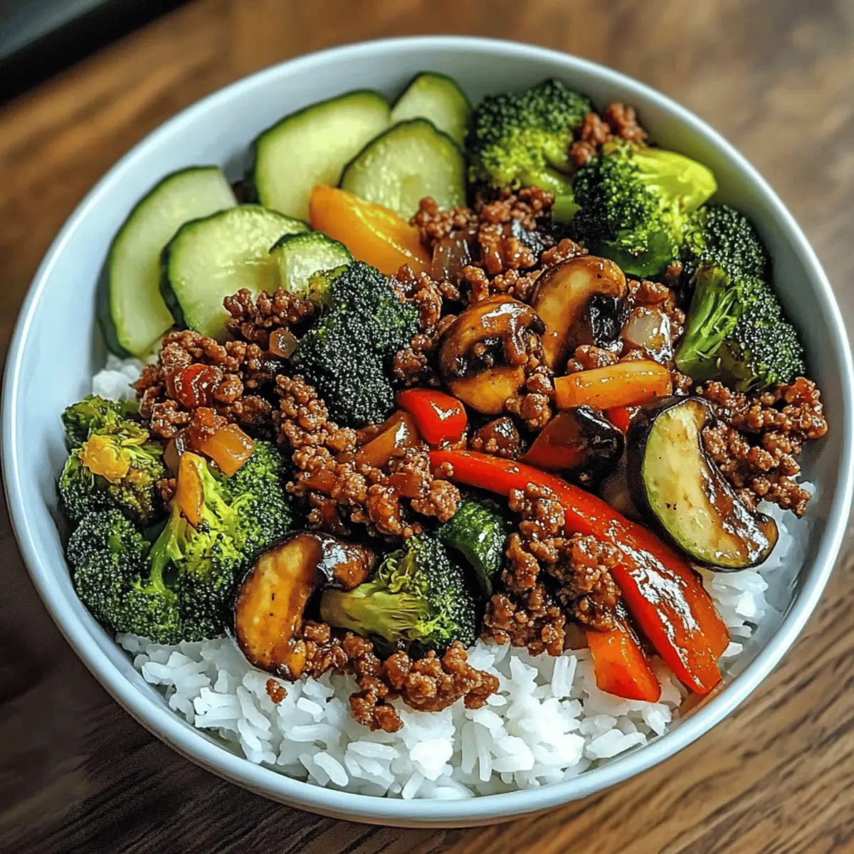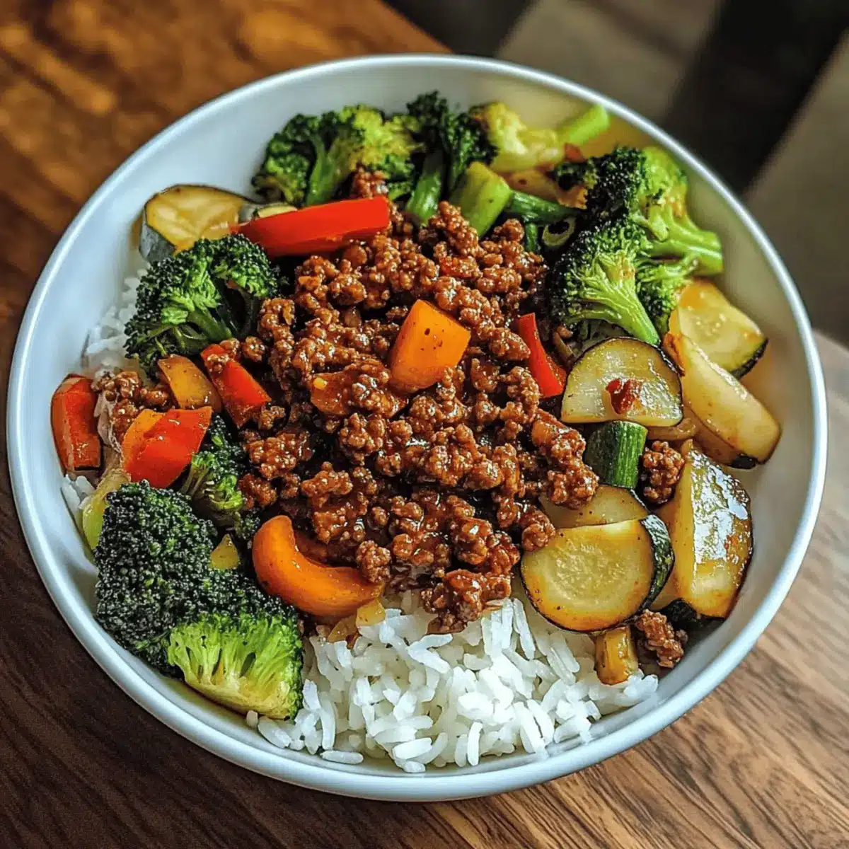 - Assemble the bowl: place a scoop of steaming rice in a bowl, top with the stir-fried ground beef mixture, and finish with sautéed vegetables. Drizzle remaining pan sauce if desired.