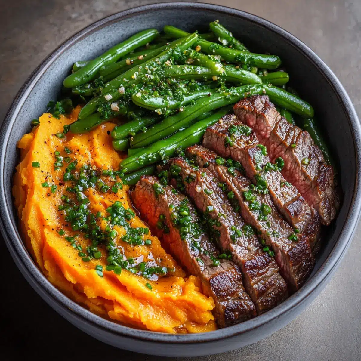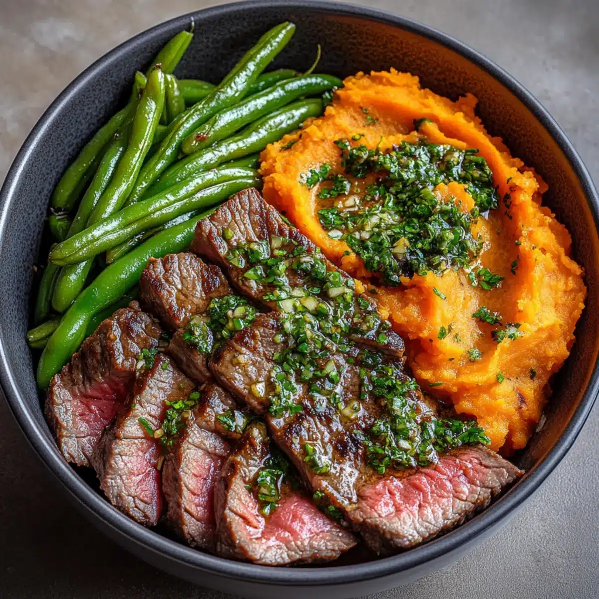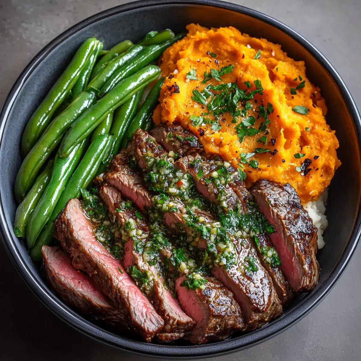 - Assemble Your Bowl: Layer sweet potato mash, sliced steak, sautéed green beans, and drizzle with chimichurri.