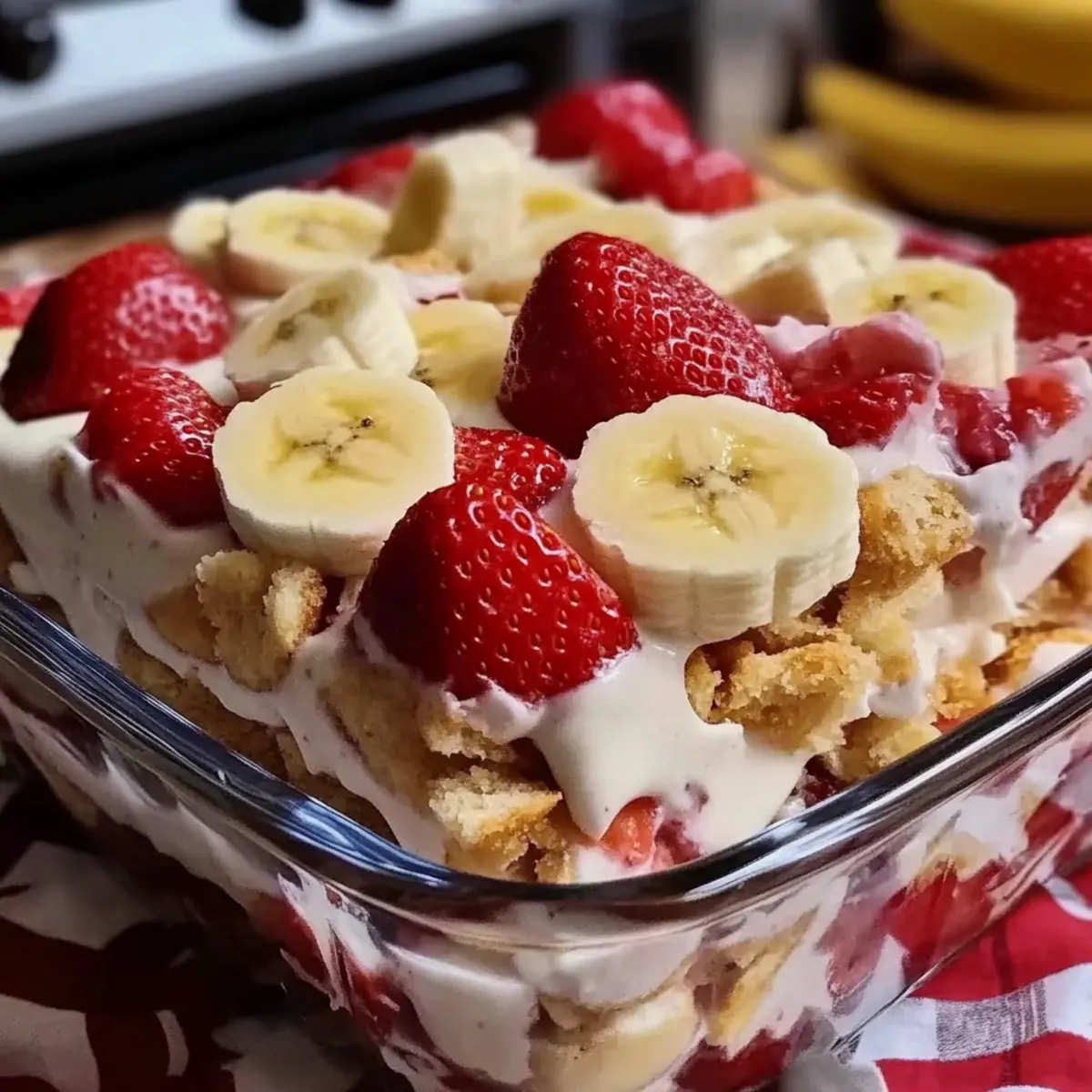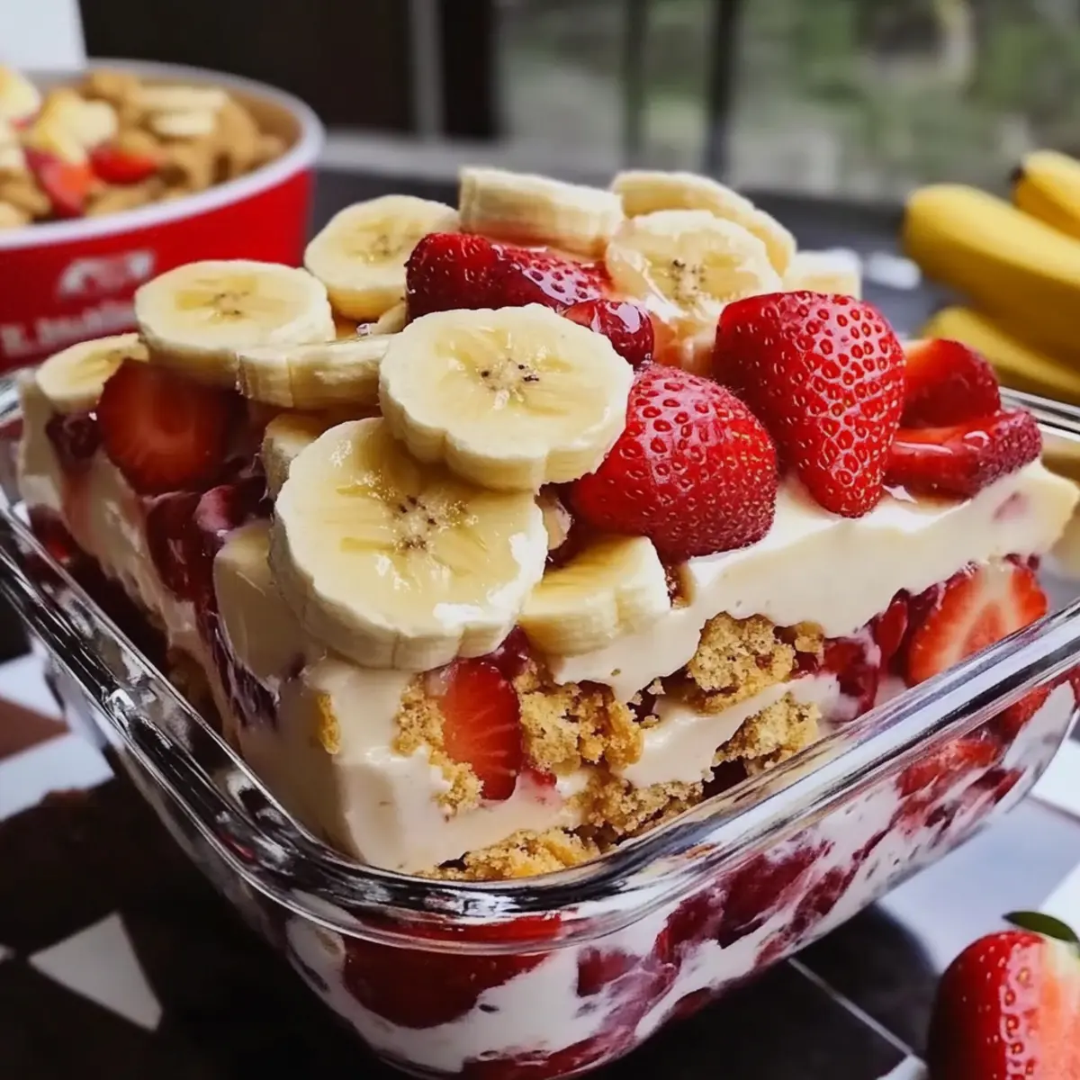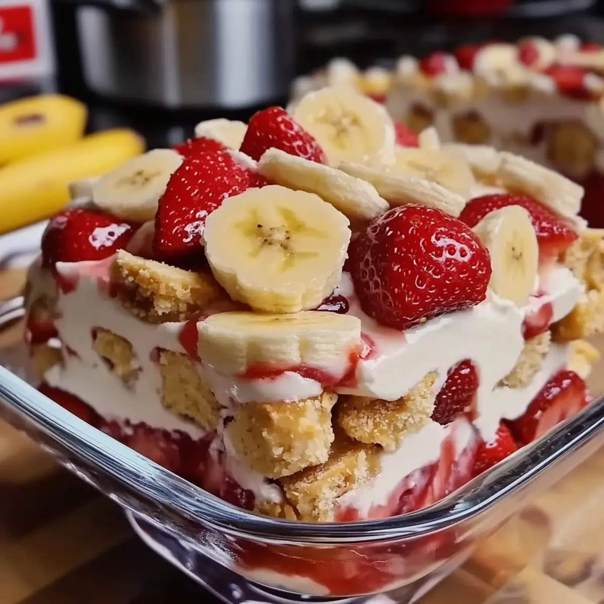 Irresistible Layers: The No-Bake Strawberry Banana Pudding Dream showcases deliciously stacked layers of fresh fruit, creamy pudding, and crunchy wafers that create a delightful bite every time.