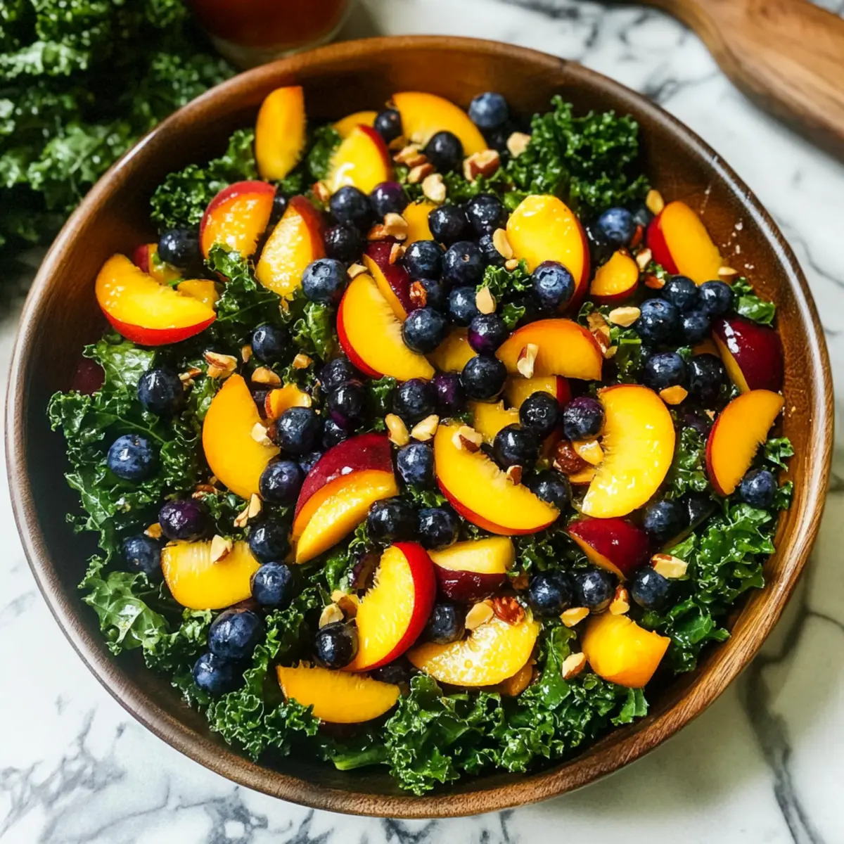 - Add the diced peaches and blueberries to the bowl of massaged kale. Drizzle the vinaigrette over the mixture and gently toss until well coated.