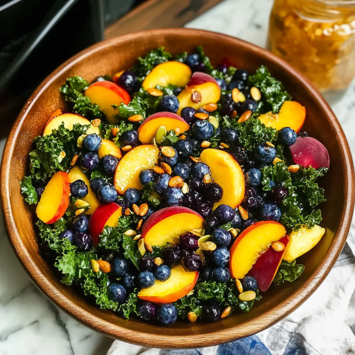 Very! This Summer Peach Blueberry Kale Salad can be readily customized. If you’re allergic to nuts or seeds, simply omit the pepitas. For a vegan option, replace honey with agave syrup or maple syrup. Always check ingredient labels to ensure safety for those with specific dietary restrictions.