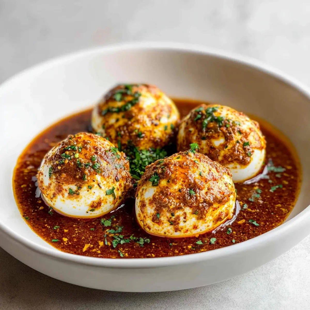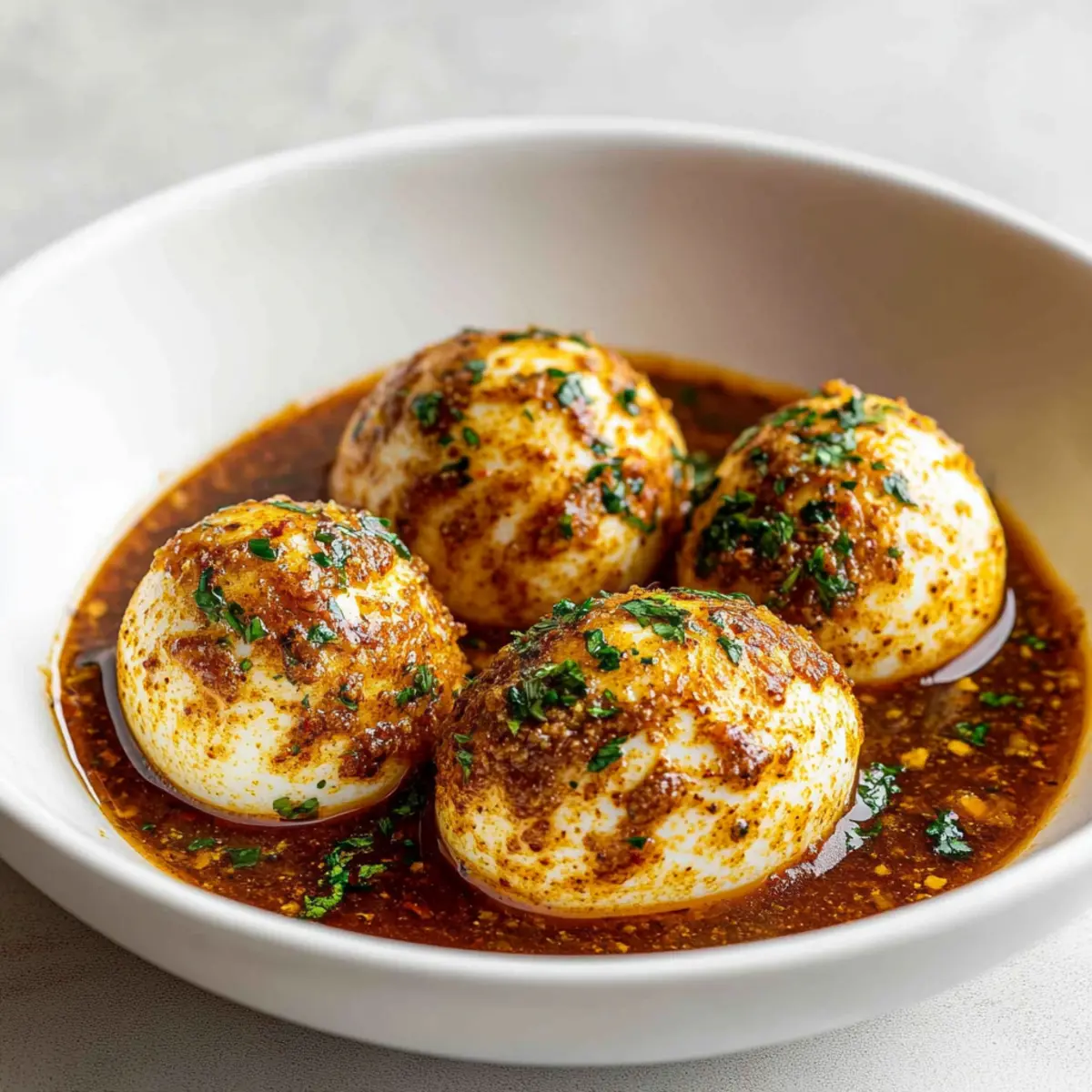 - Serve the Dish: Place the peeled eggs in a bowl and pour the sauce over them. Garnish with parsley.