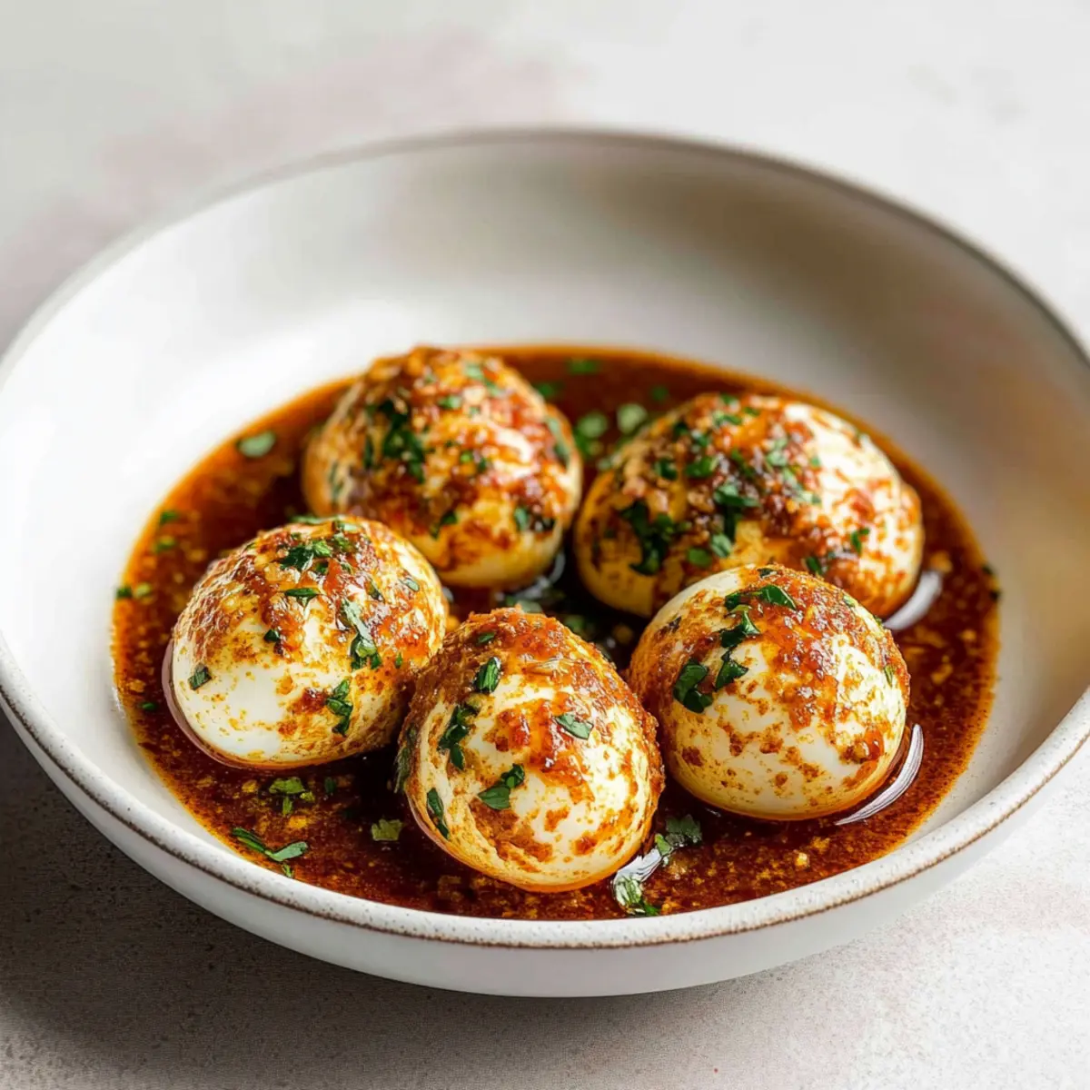 To serve the TikTok Egg Boil, place the peeled eggs in a bowl and pour the flavorful sauce generously over them. Garnish with chopped flat-leaf parsley for a touch of freshness and color. Your spicy TikTok Egg Boil is now ready to enjoy!