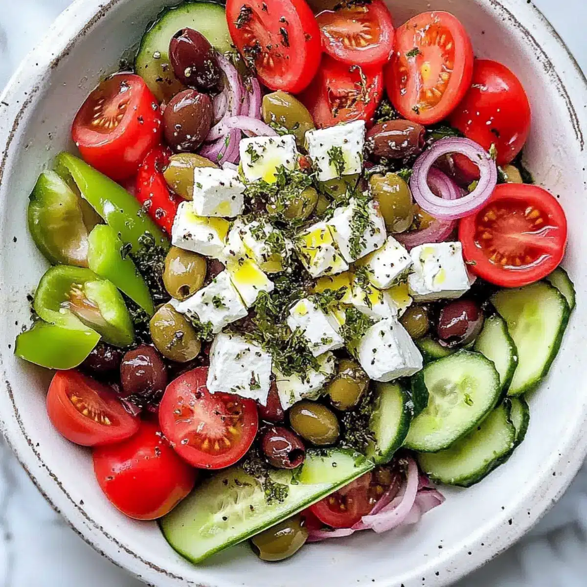 Healthy and Wholesome: Packed with nutrients, this Traditional Greek Salad is a great addition to any healthy eating plan, rich in essential vitamins.