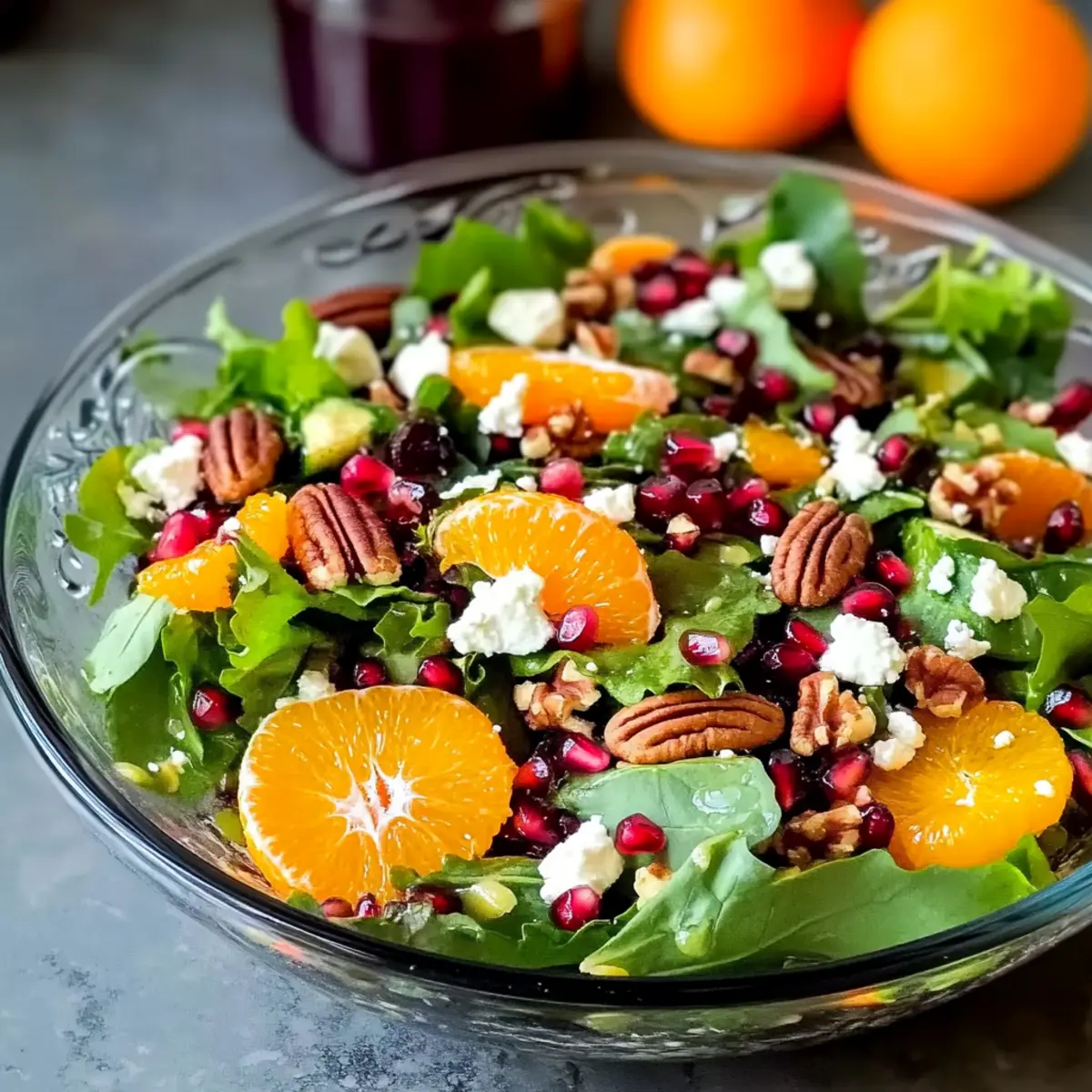 Once the salad is tossed, it’s best served immediately to maintain its vibrant freshness and crisp texture. Ladle generous portions onto plates, ensuring each serving features a mix of greens, oranges, pomegranate seeds, feta, and pecans. This colorful Winter Salad brings a cheerful touch to any meal, so enjoy it right away for the best experience!