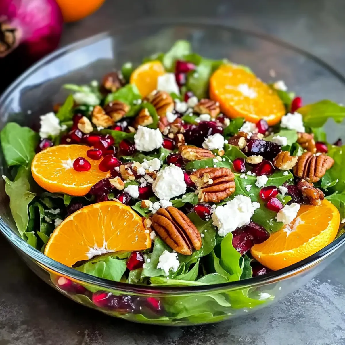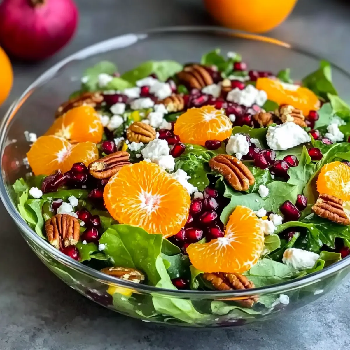 - Once the salad is tossed, serve immediately to maintain its vibrant freshness. Ladle generous portions onto plates, ensuring each serving features a mix of greens, oranges, pomegranate seeds, feta, and pecans.