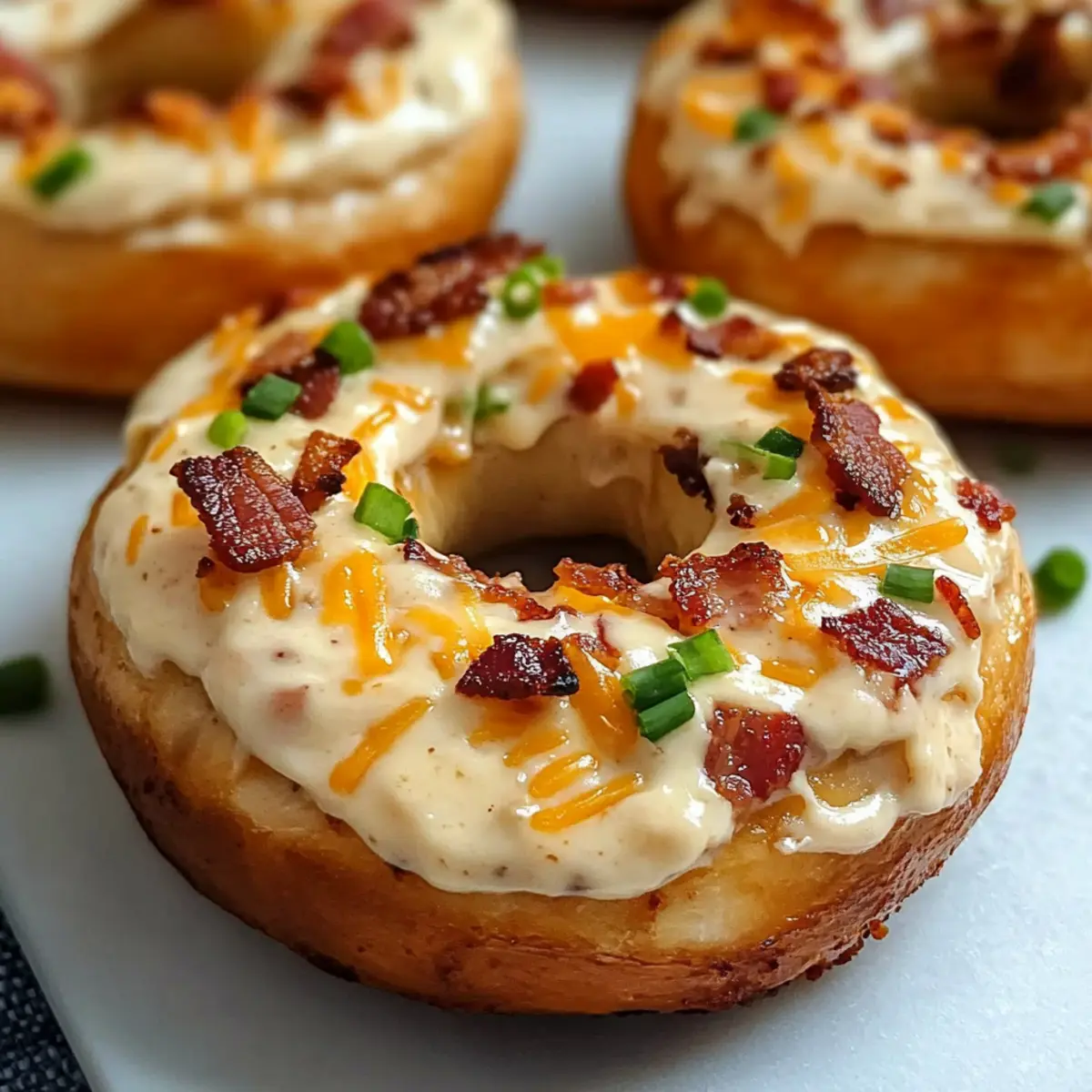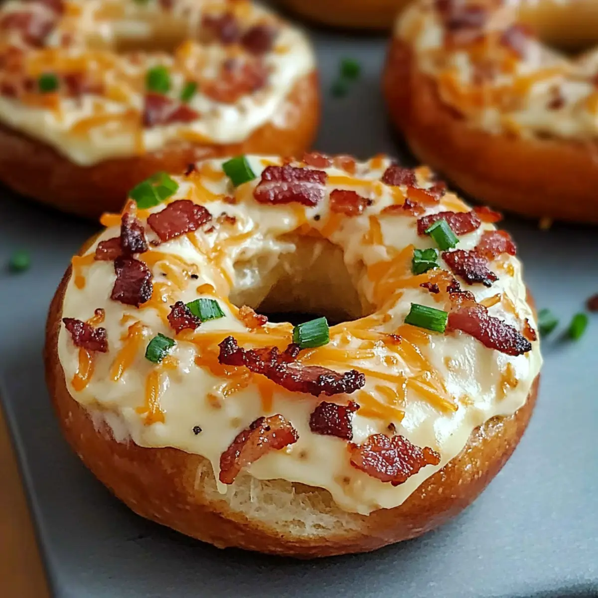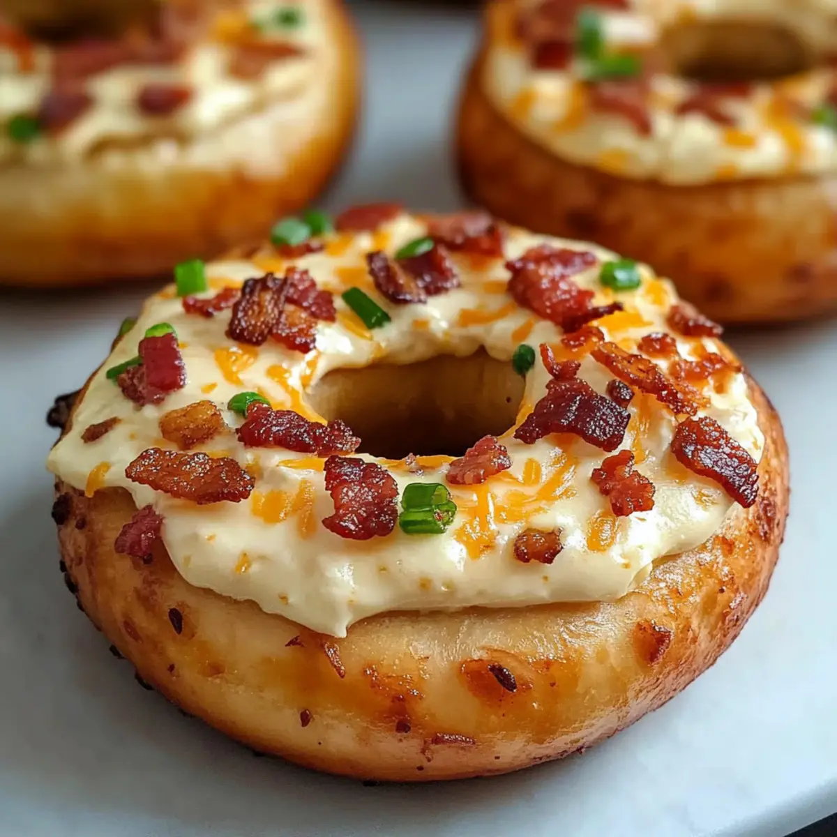 Once baked, remove the bagels from the oven and let them cool for a minute. For an extra touch, garnish with reserved crumbled bacon and chopped chives or green onions for freshness. Serve these delightful Zesty Bacon Cream Cheese Bagels immediately for the best creamy and crispy texture, and enjoy this comforting breakfast treat with your loved ones!